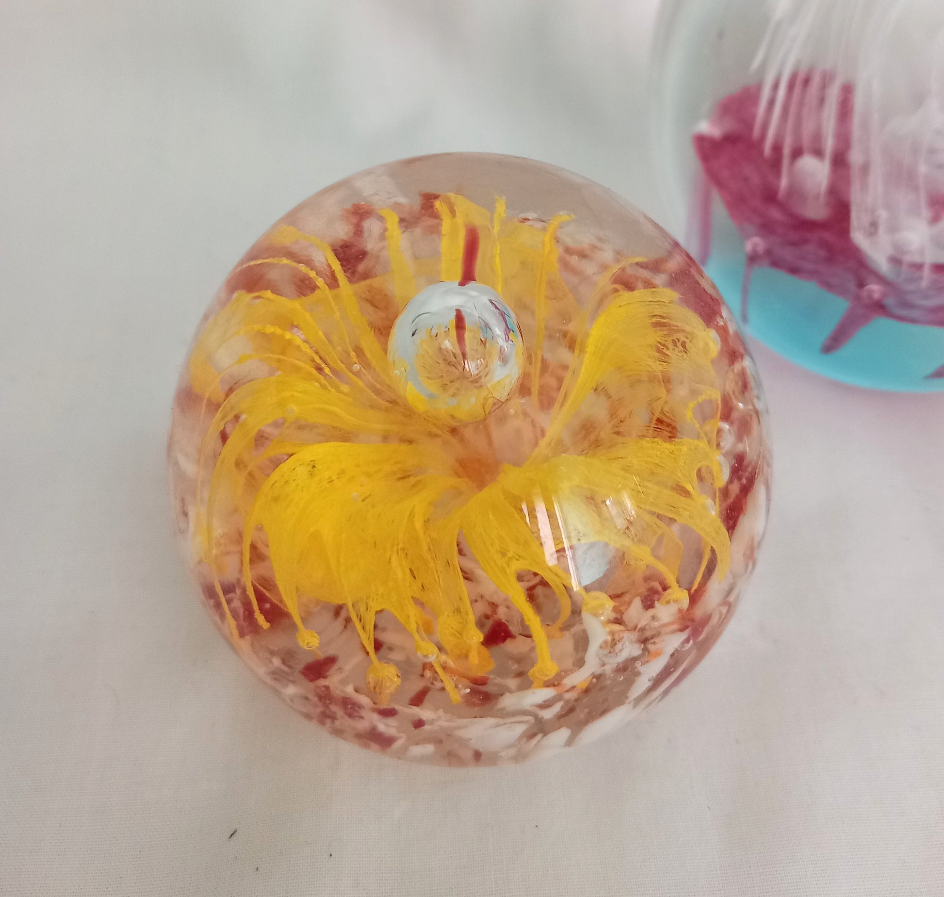 3 art glass paperweights in pink, yellow and blue swirl patterns, 4.5, 6 and 8 cm. All in good condition with no chips or cracks. None are signed or labelled.