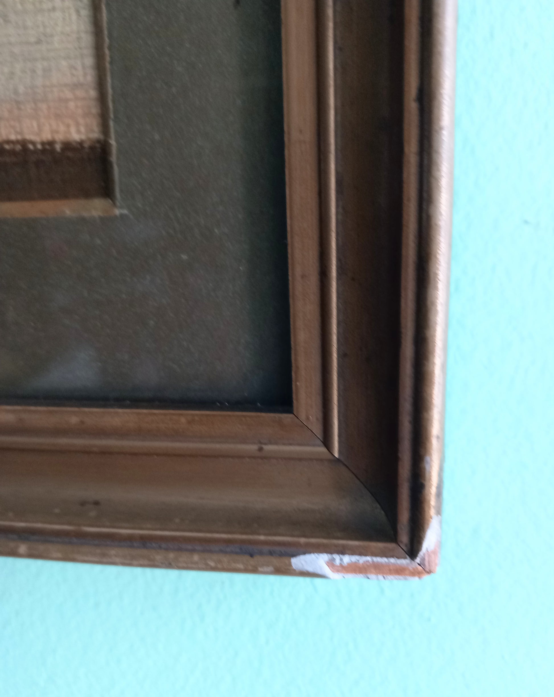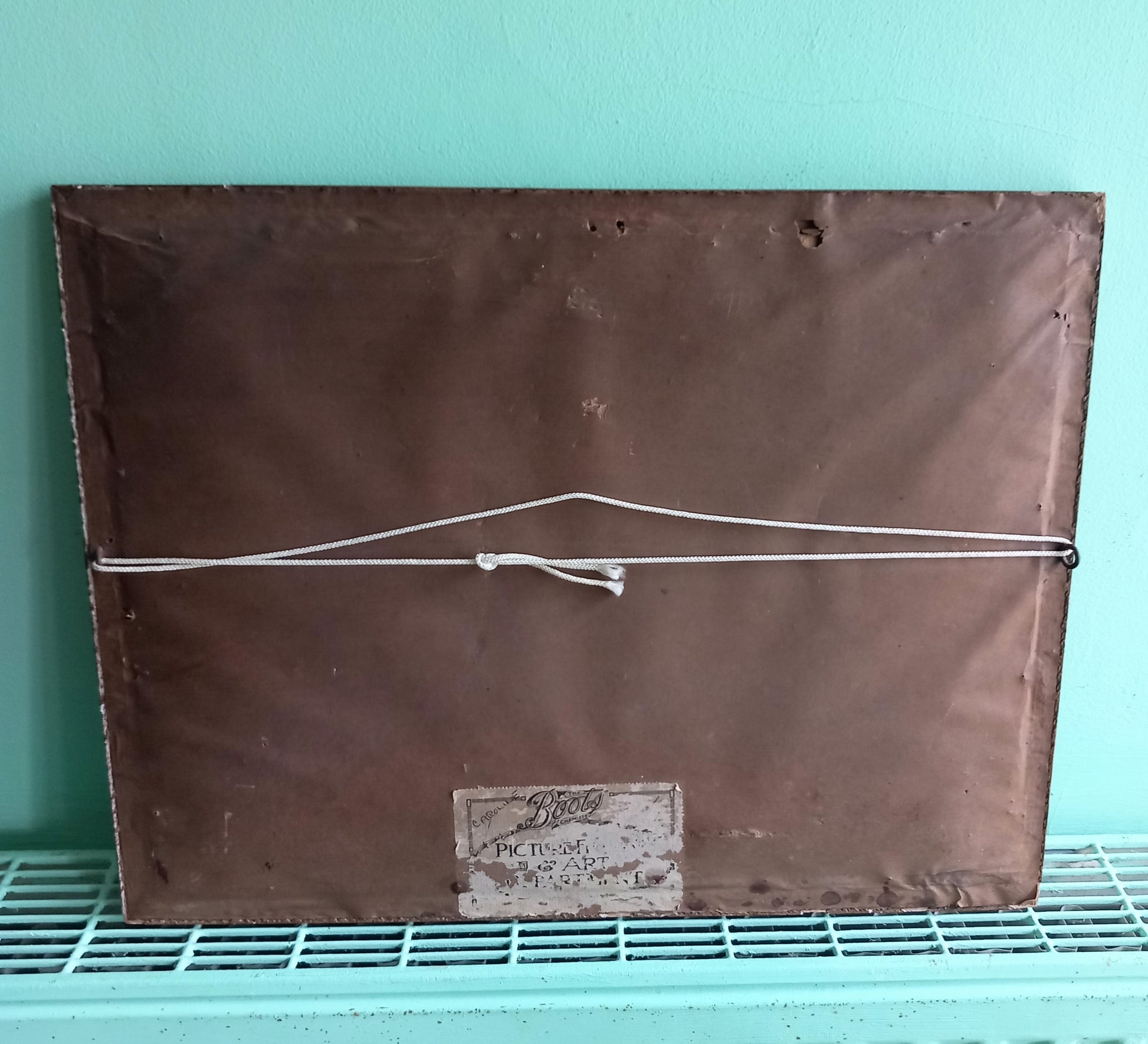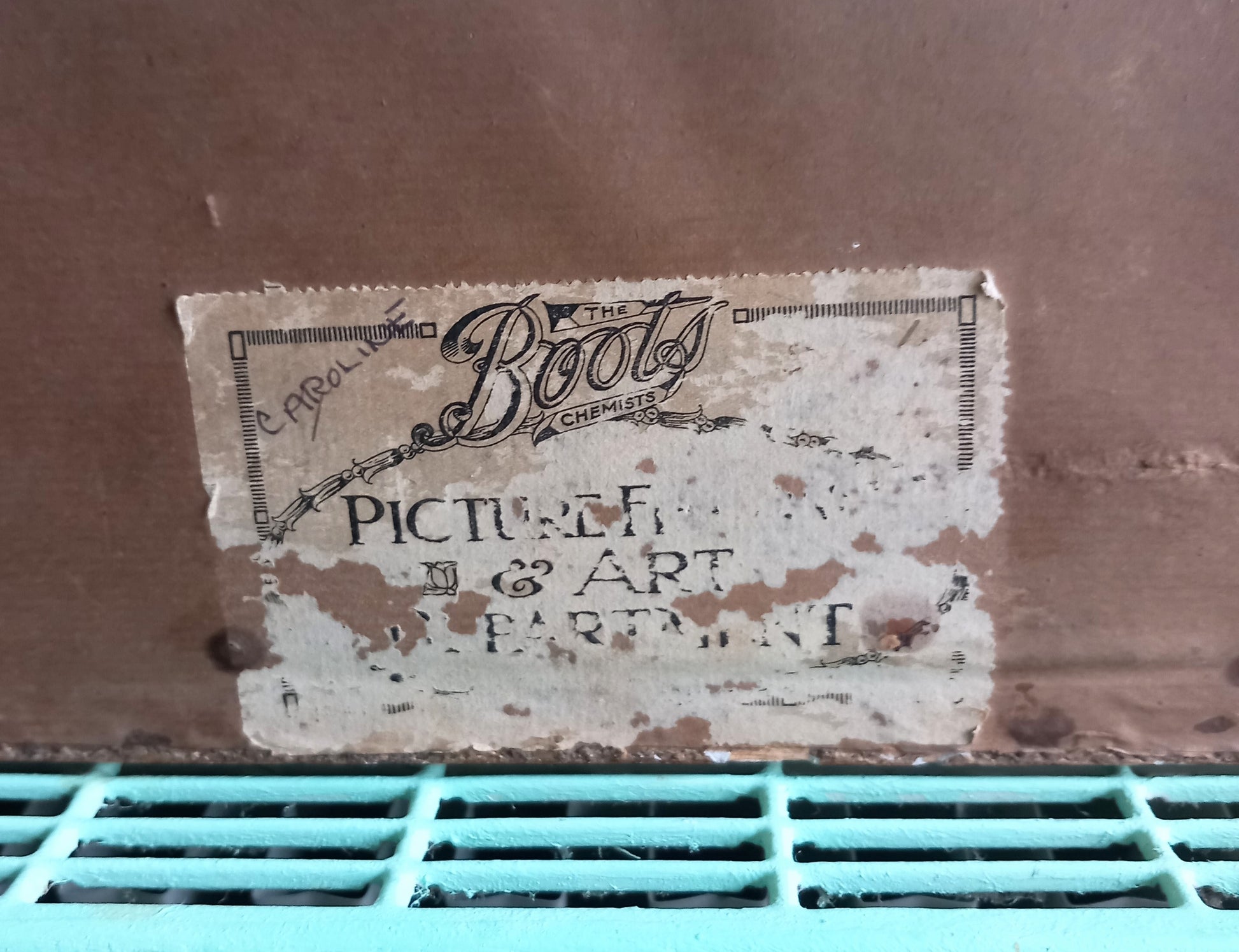 Antique oil painting of still life with pancheon bowl, apples and water jug, 17 x 13 inches with gilt wooden frame. It has been framed by Boots and appears to be early 20th century based on the sticker. Good condition showing some wear and cracking to the paint as pictured.