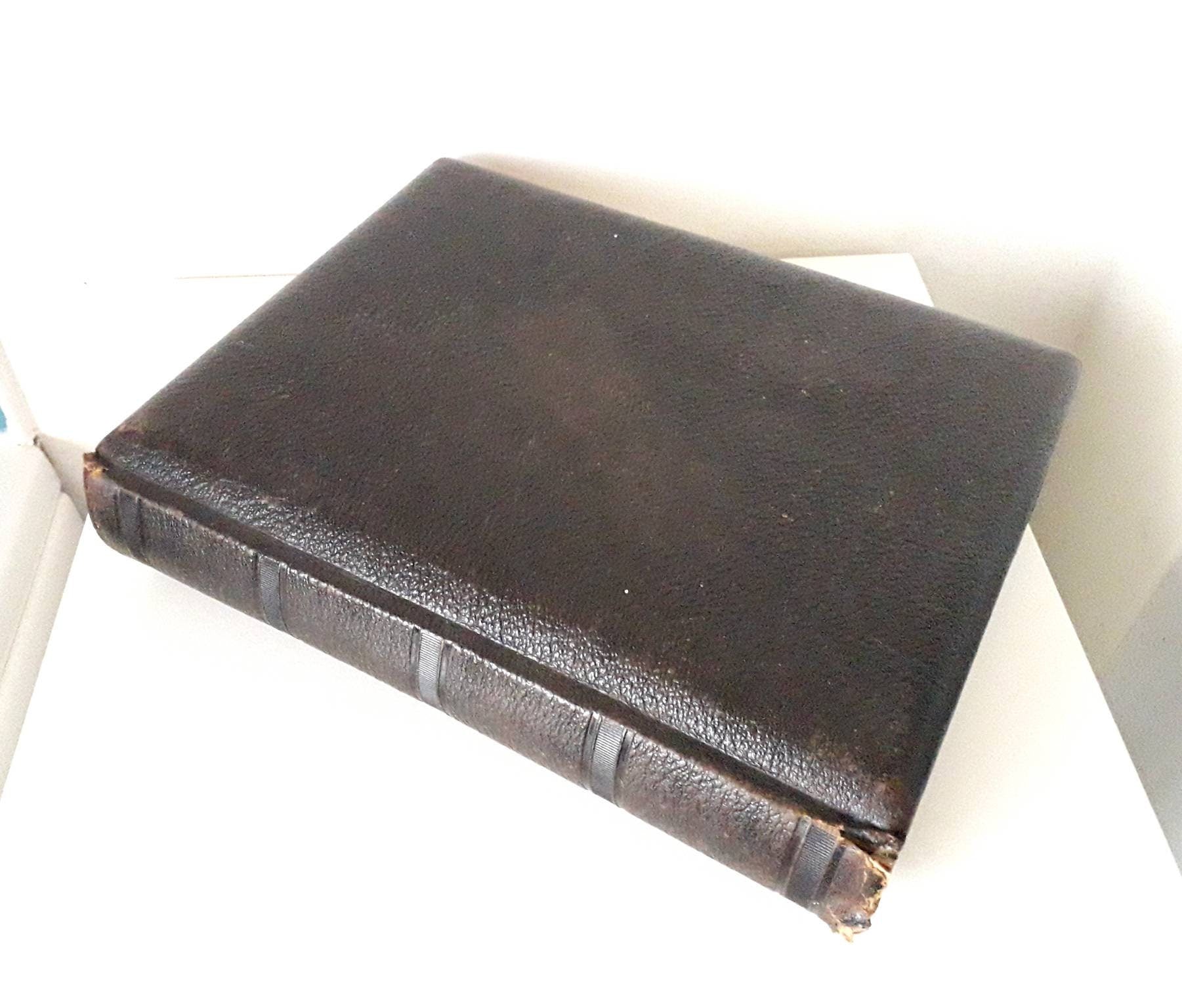 Dark brown leather binding with gilt edging to the pages, 11 x 9 inches. The album has numerous colour mounts illustrated with flowers and landscapes, it also has plain mounts. No photos. This is in good condition for its age but all of the plain mounts have been fixed with tape as pictured.