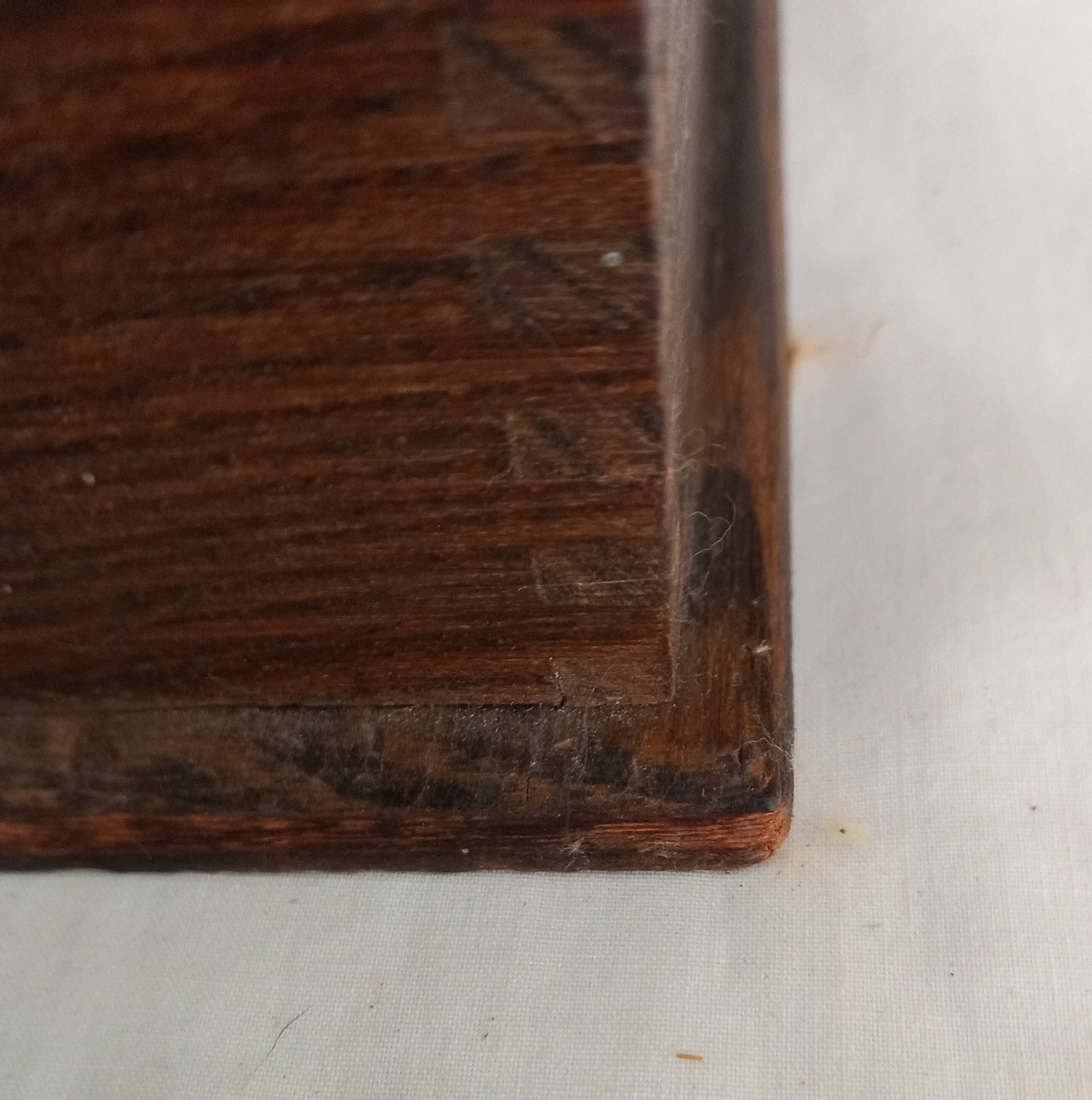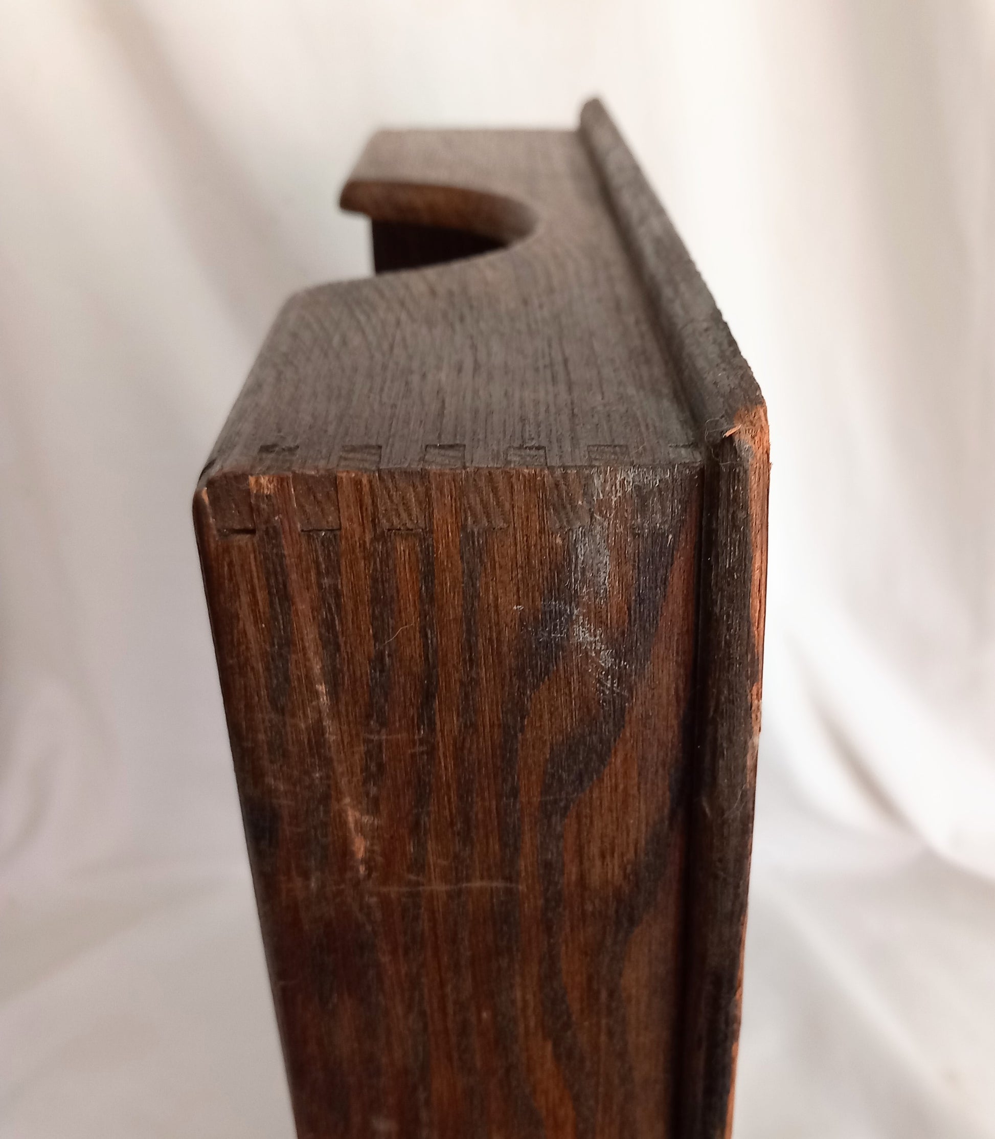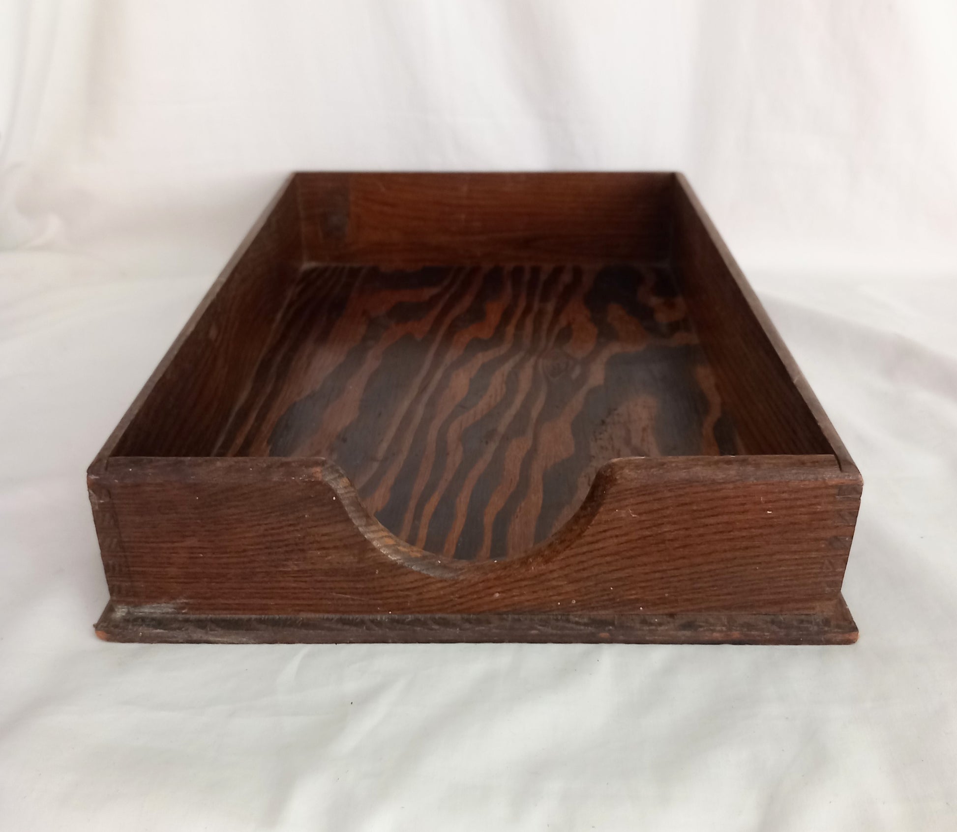 Antique c1920s oak wooden filing tray with dovetail corners, 15 x 10 x 2.5 inches. This is in good vintage condition showing age related wear. It has a small chip to one back corner and some scuffing to the bottom edges.