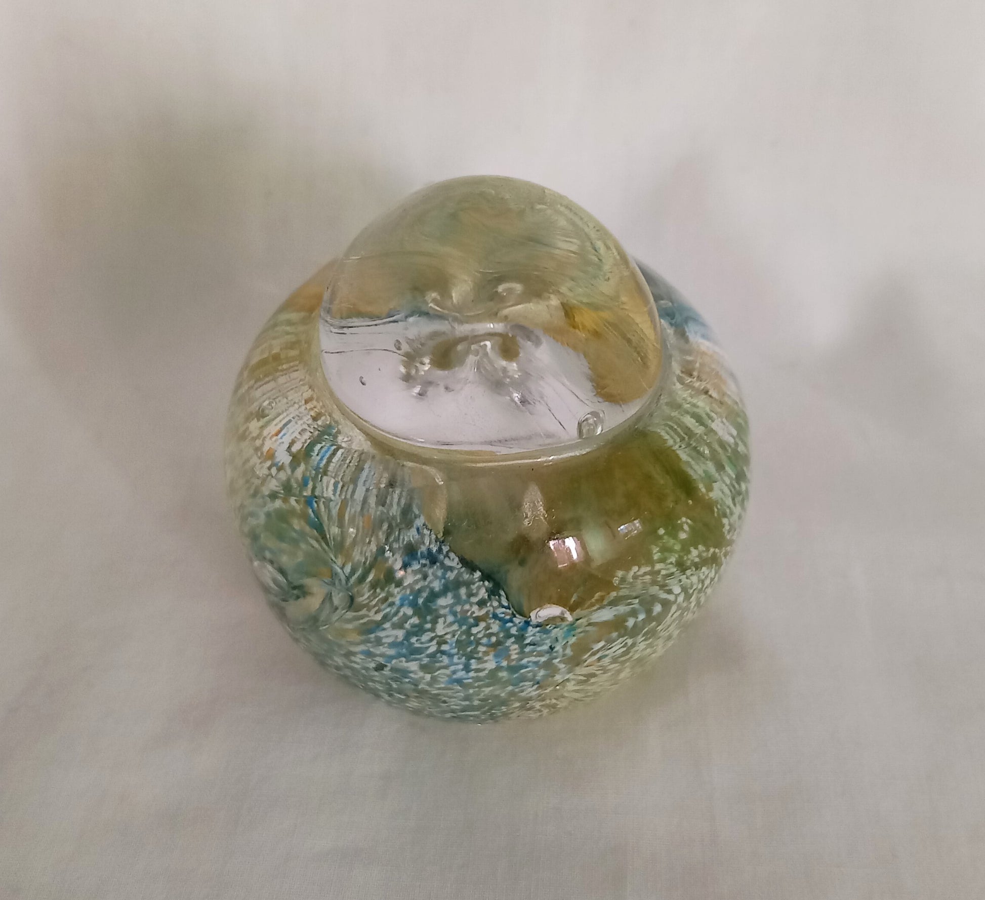 Art glass bird paperweight in mottled blue, white & yellow glass, signed JGD. 3.5 x 2.75 x 2.5 inches. Good condition with no chips or cracks.