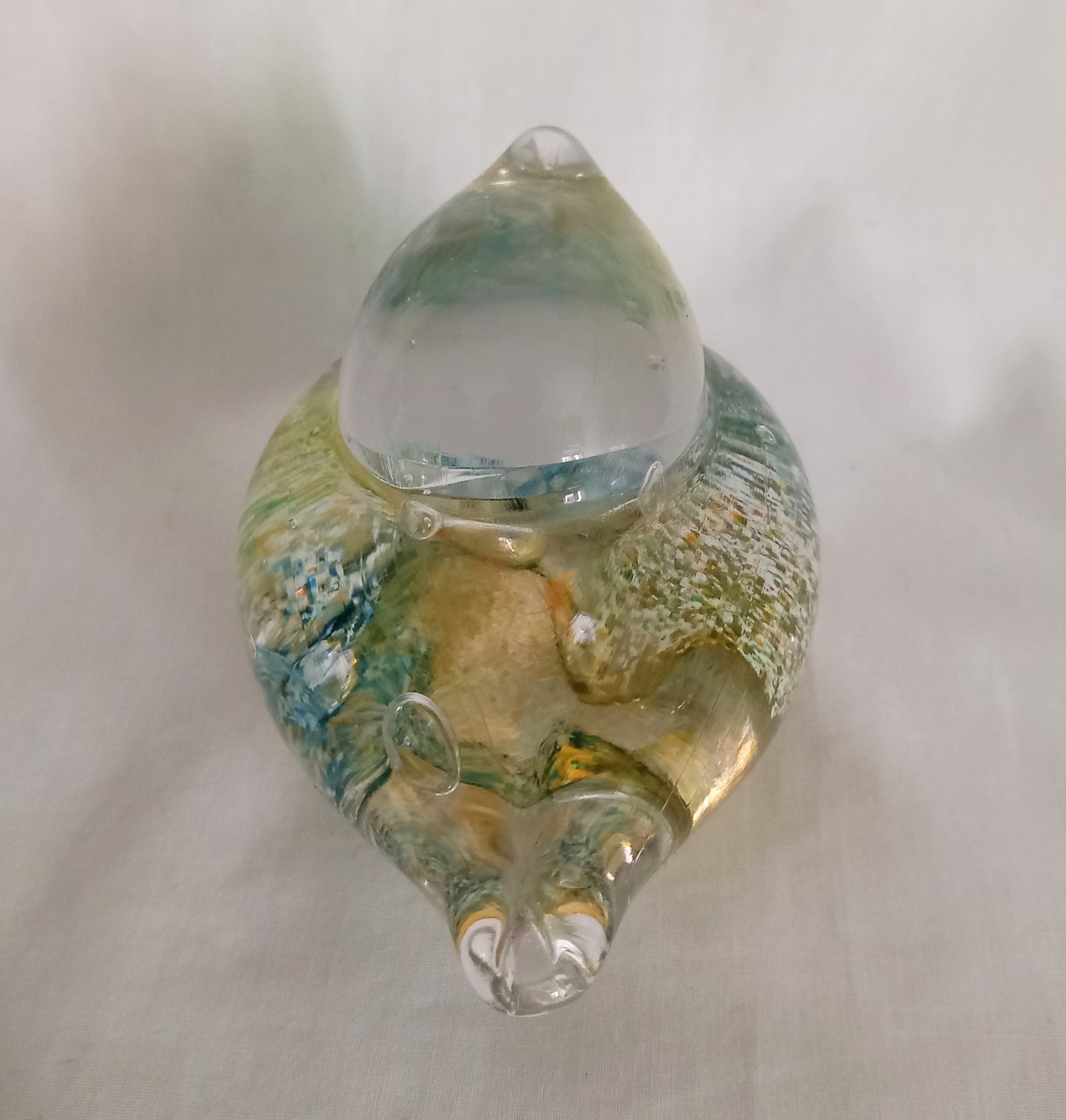 Blue & yellow mottled art glass bird paperweight signed JGD