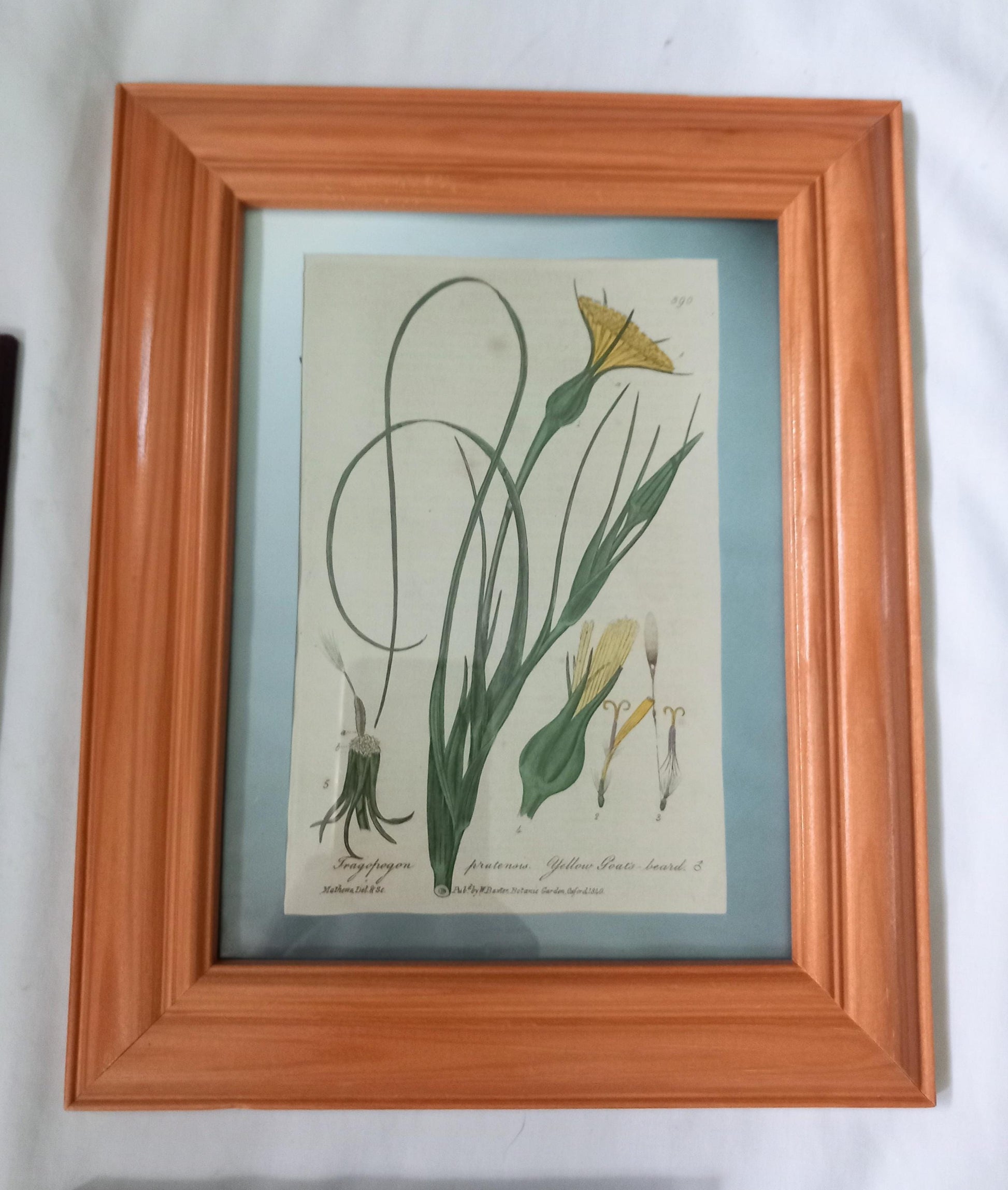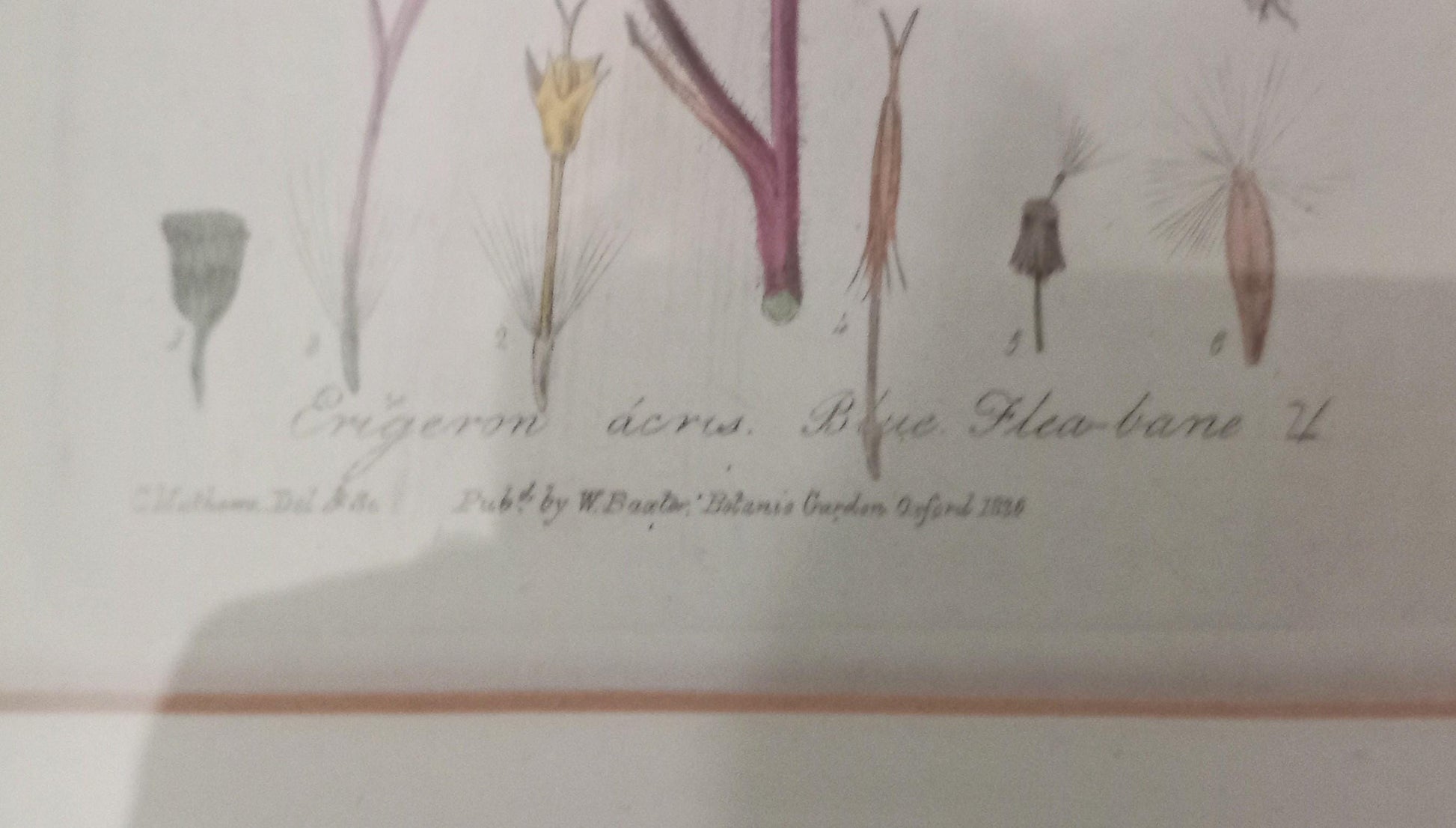 Antique Victorian hand coloured botanical plates published by W Baxter, Botanic Garden, Oxford. These show Blue Flea Bane 1836, Yellow Goats Beard 1840 and Hemp Agrimony 1836. These are framed in vintage mismatched wooden frames. 14.5 x 12, 8.25 x 6.25 and 10.5 x 8.5 inches overall. Good antique condition showing a little age related wear.