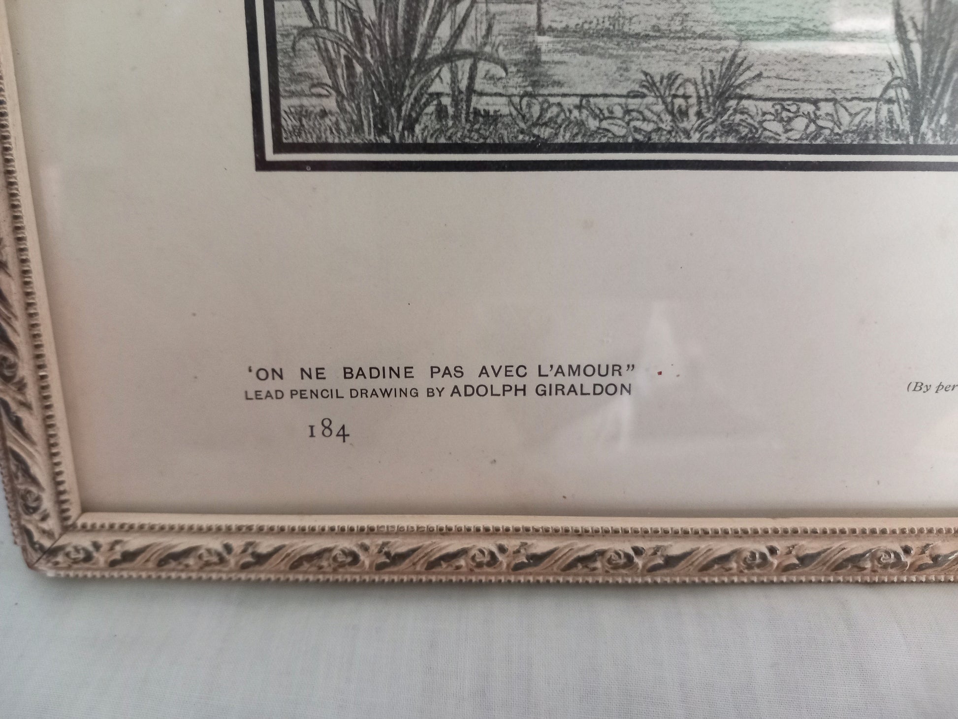 Framed vintage print of an original drawing By Adolph Giraldon, with vintage white wood gilt decorated frame, 11.5 x 8.5 inches. The paper has some foxing and yellowing due to age.