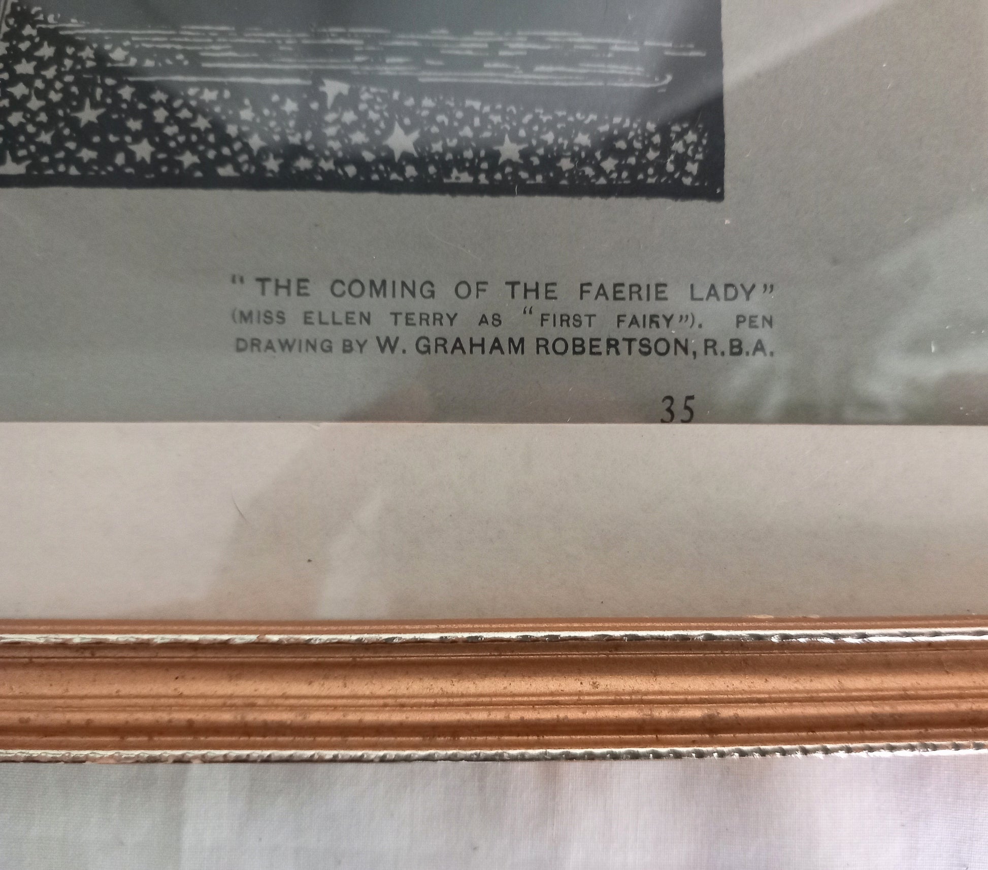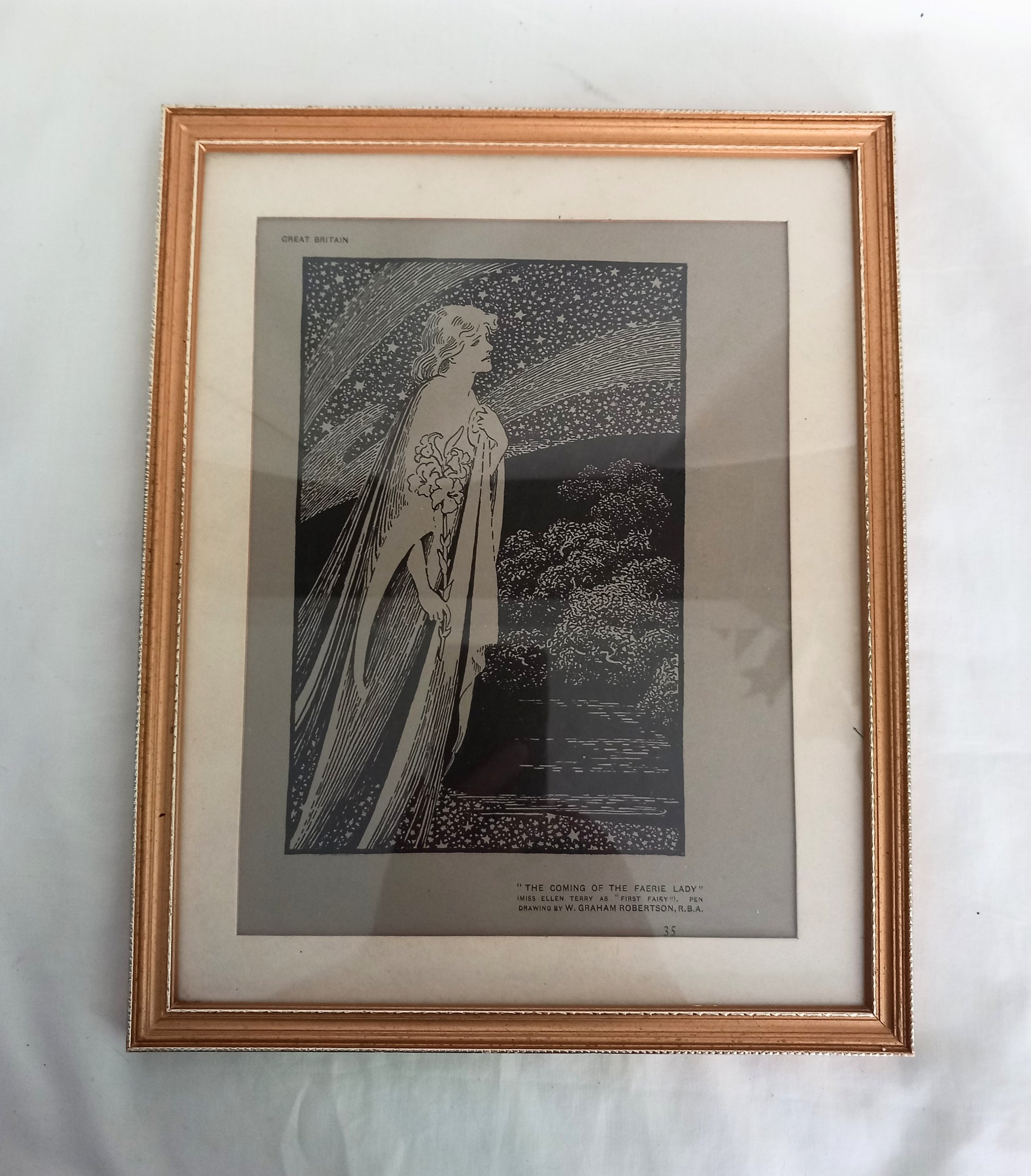 Framed vintage print of an original drawing By Graham Robertson RBA 'The Coming of the Faerie Lady'. This shows the actress Ellen Terry as First Fairy. It is framed in a vintage 1970s gilt decorative frame, 12.5 x 10 inches. This was taken from a broken c1920s art book. The paper has some foxing and yellowing due to age.