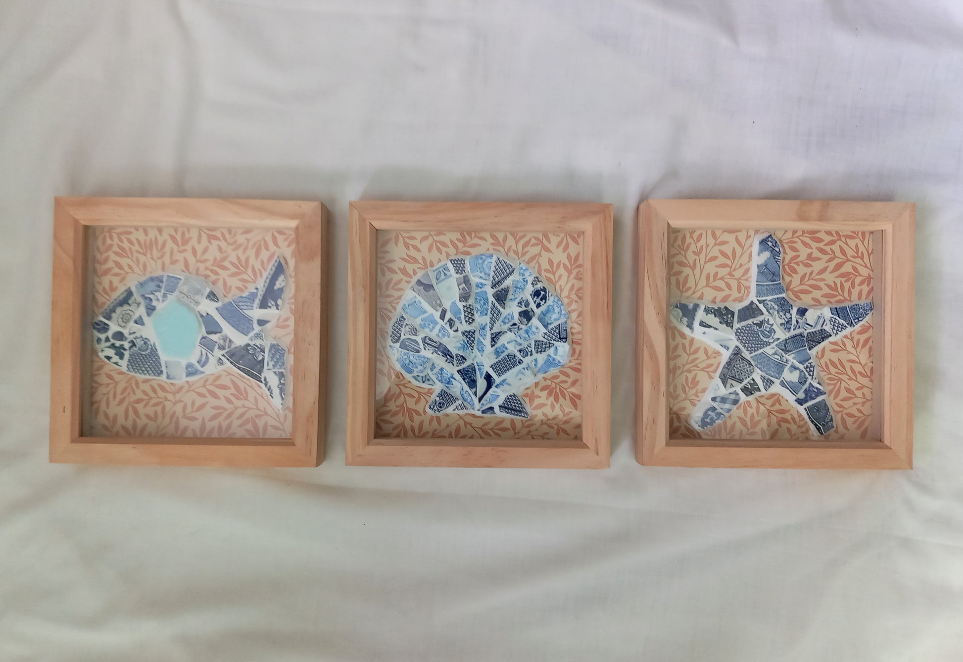 Set of 3 hand made upcycled mosaic decorative wall art made from sherds of blue and white china in the form of a fish, a starfish and a scallop shell. These are set on a background of pink leaf design vintage wallpaper and mounted in natural pine box frames. These measure approx 7.75 x 7.75 inches and are ready to hang.
