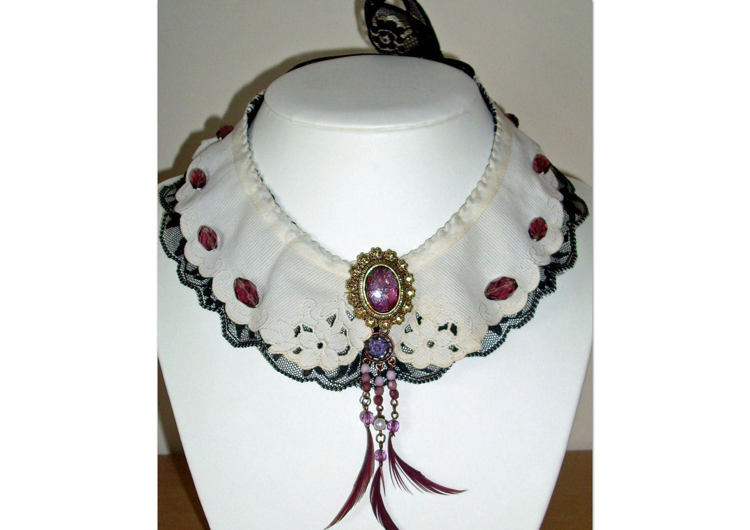 This unusual necklace is hand made from an original art deco off-white collar with cutwork flower pattern and scalloped edges. It has been backed with black leaf design lace with scalloped edging (a generous width so that it peeps through from underneath). The necklace is decorated with an original 1960s goldtone brooch with purple swirl lucite stone (this is fully detachable to be worn elsewhere if required) and further adorned with original 1950s facetted crystal beads in graduated sizes around the edges. It is finished with a modern purple flower design tassel with beading and feathers and black lace ribbon straps. The collar measures approx 2 inches wide, with the straps being approx 12 inches in length and 1 inch wide.