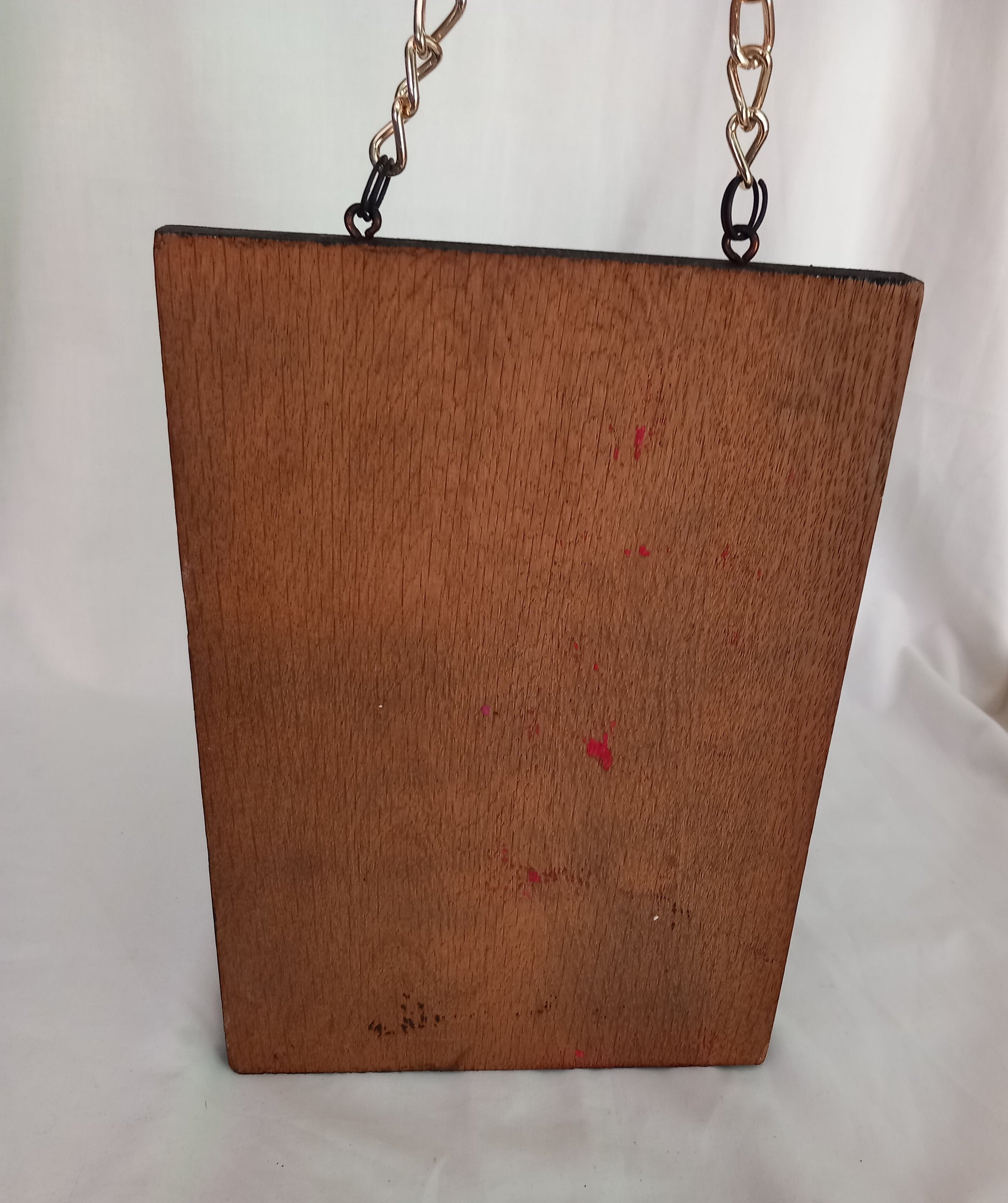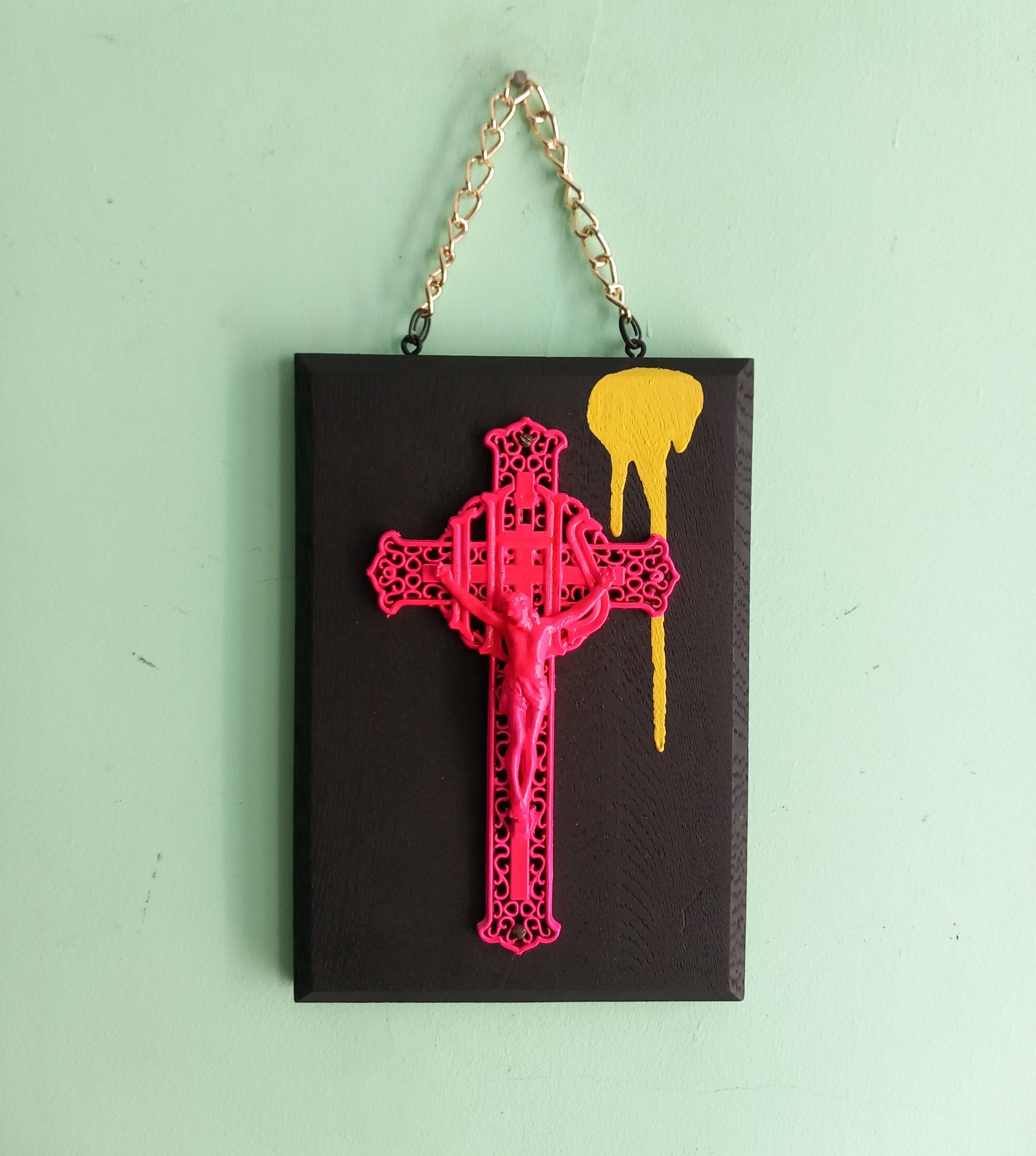 Hand made vintage upcycled neon Jesus crucifix wall art, 10 x 7 inches. This is a solid wood black painted background mounted with a neon pink plastic crucifix and yellow paint drip. It is finished with a goldtone chain. Ready to hang.