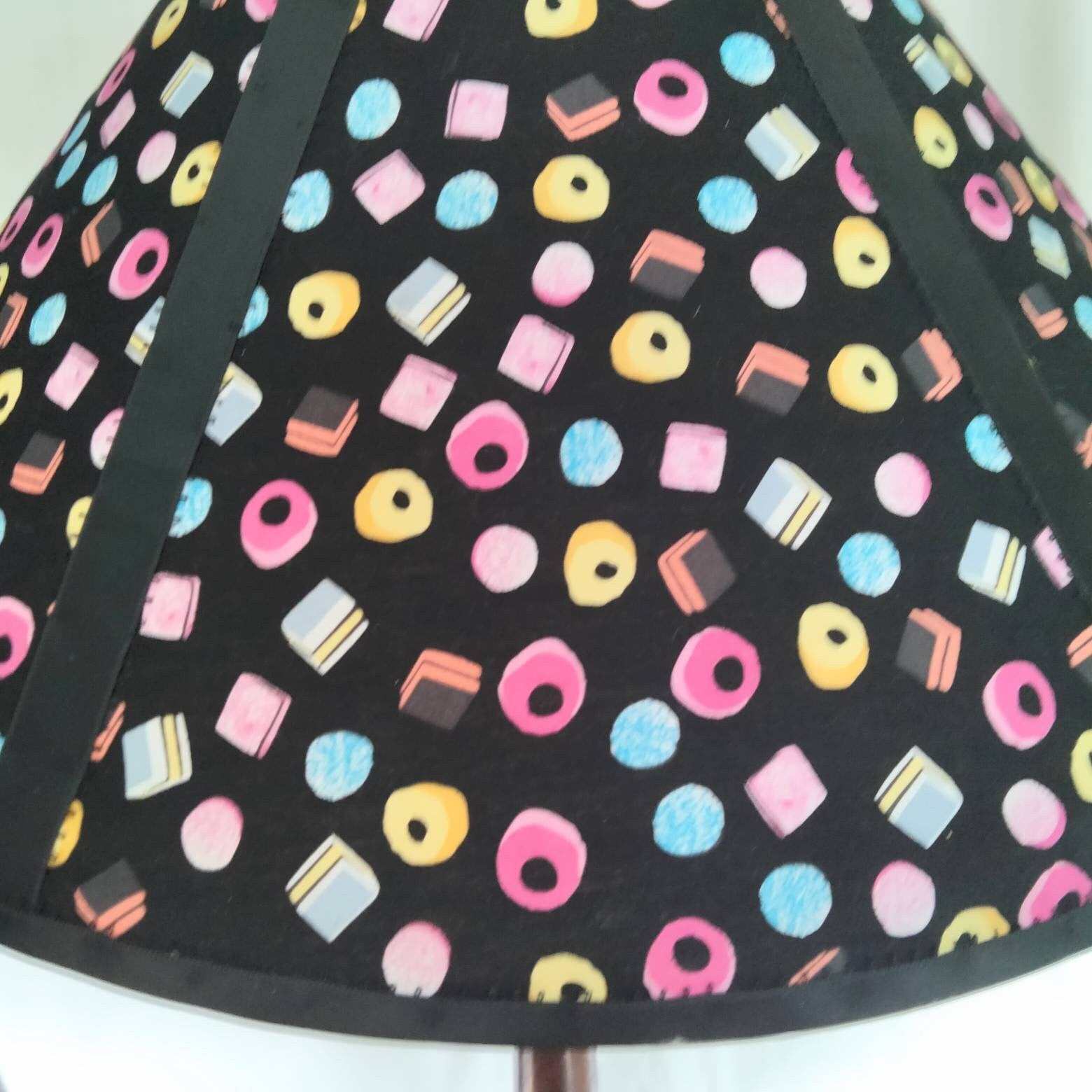 Upcycled OOAK hand made lampshade made from a vintage cone shade covered with quirky liquorice allsort print fabric and finished with black satin ribbon. Approx 8.5 inches tall and 20 inches wide. Suitable for a large table lamp, standard lamp or ceiling pendant. This is hand made item and is not perfect, there is some visible glue on one side as pictured.