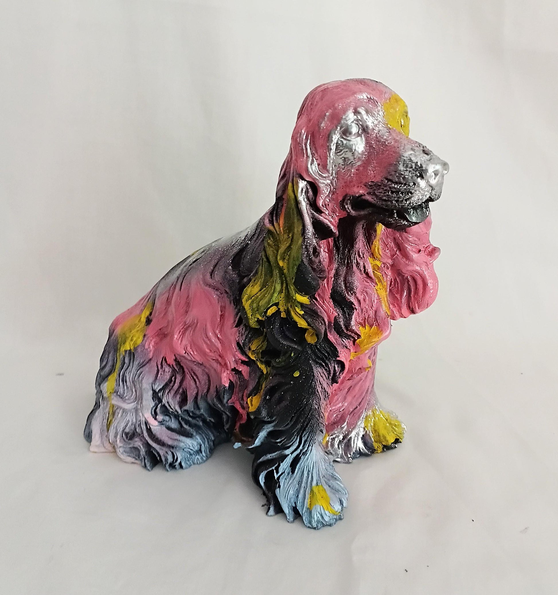 Hand painted pop art paint drip Spaniel dog statue, 6.5 inches tall. This is in good condition and newly upcycled.