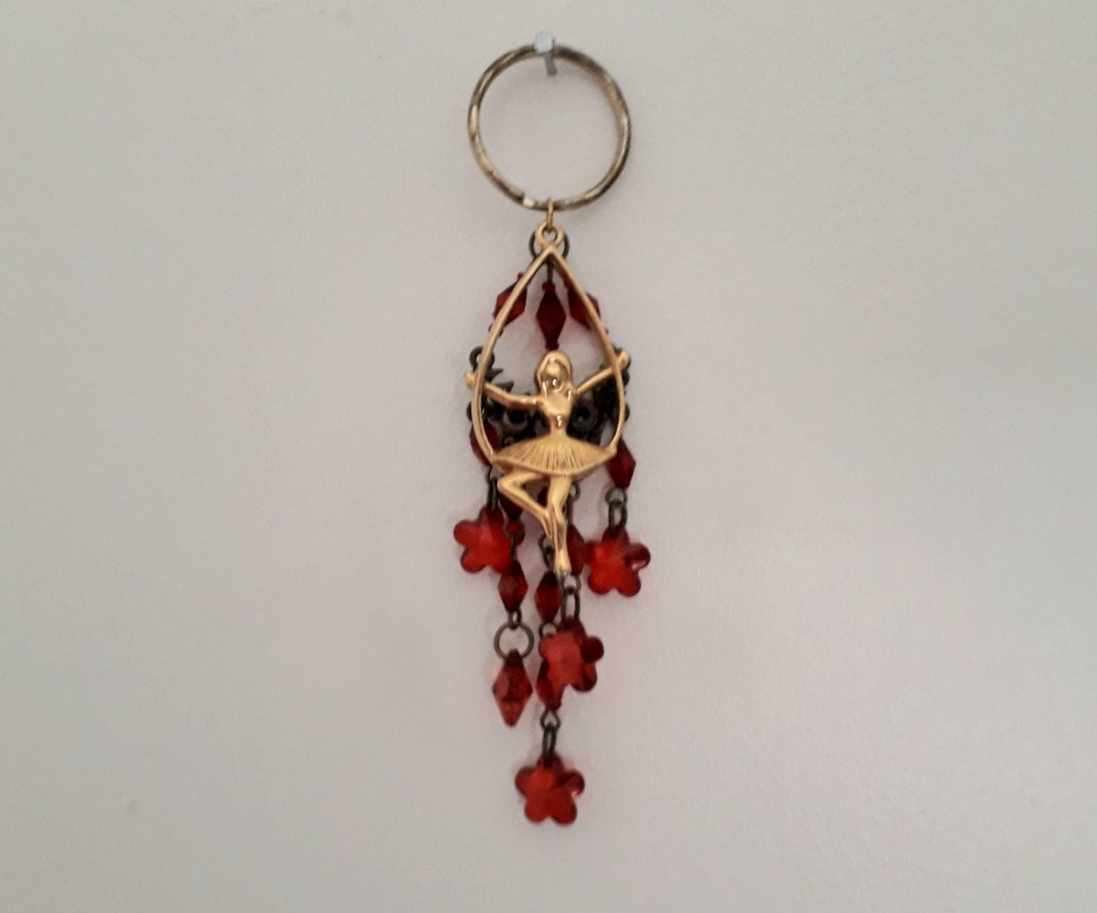 This handbag or purse charm keyring features a vintage goldtone ballerina/ballet dancer charm against a goldtone tassel charm with red acrylic flower beads.