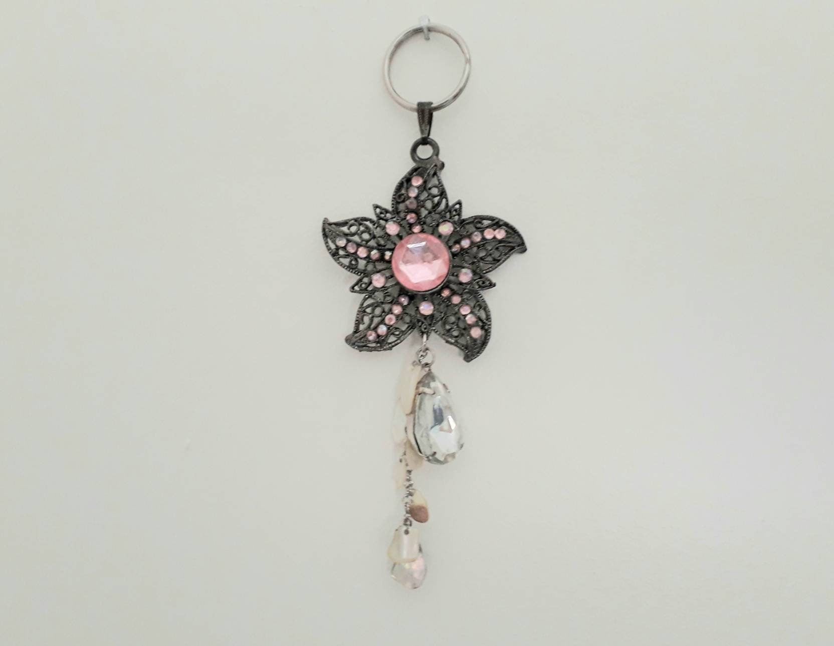 Hand made bag charm keyring silvertone and pink diamante flower with mother of pearl and diamante charms