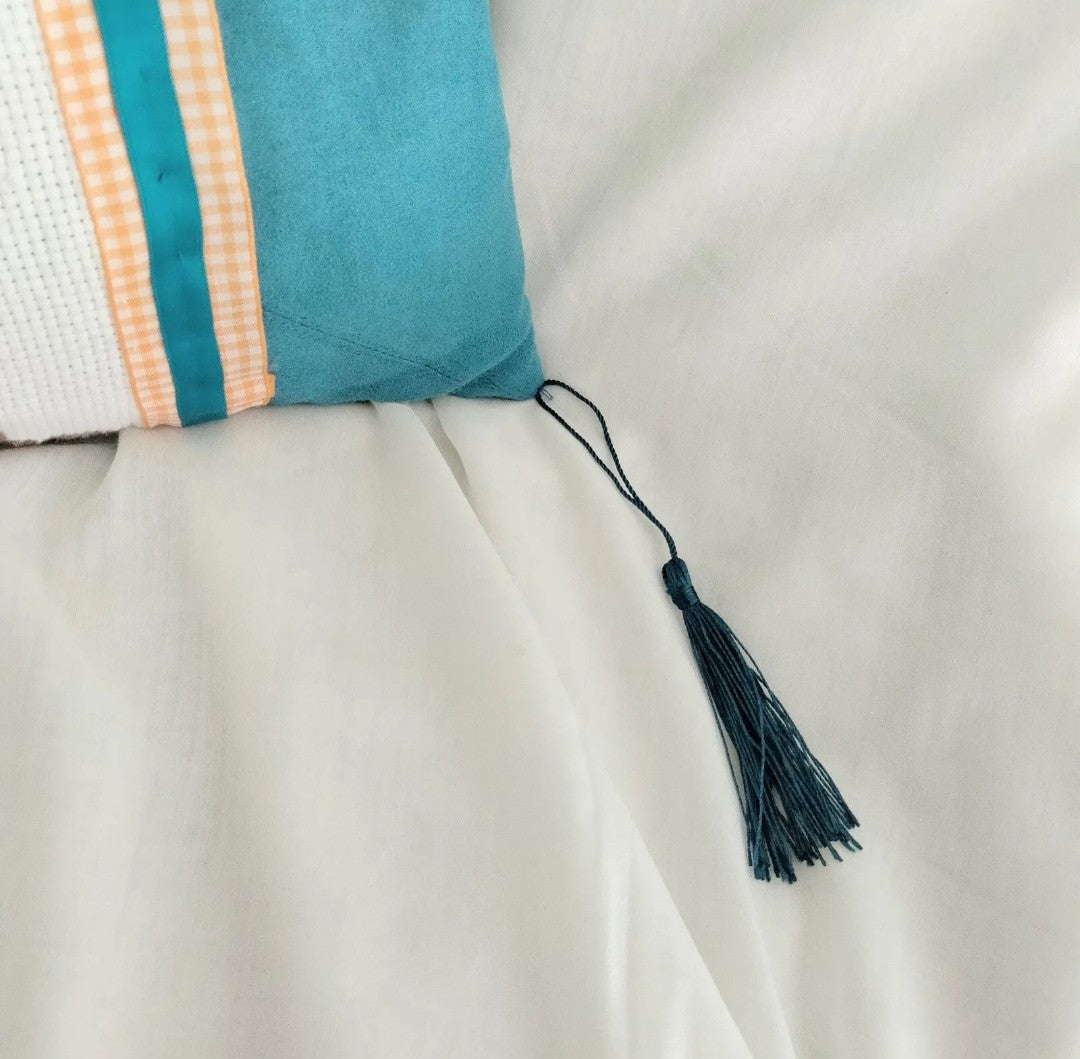 Hand made upcycled cushion made from a rectangular teal/turquoise blue suedette cushion with orange and yellow hand sewn needlepoint tapestry of a tree. This is finished with orange gingham and teal satin ribbon edges, teal tassels on each corner and red glass bead embellishments. Approximately 45 x 30 cm. The cover was freshly washed prior to construction and is not removable (surface clean only).