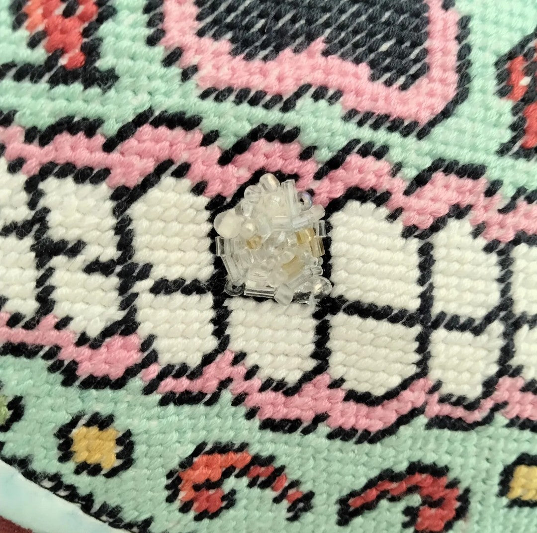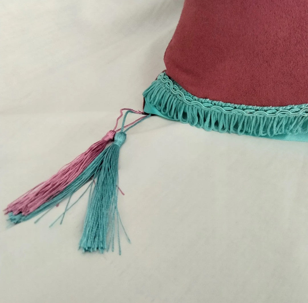 Hand made cushion made from deep red suedette fabric with a blue, red and pink hand sewn needlepoint tapestry of a sugar skull. The skull is edged in pale blue velvet ribbon and the cushion is finished with blue satin ribbon, blue fringing and blue and pink tassels on each corner. It also has a clear glass bead embellished tooth. Approximately 35 x 35 cm. The cover is not removable (surface clean only). This is a hand crafted item and therefore is not perfect.