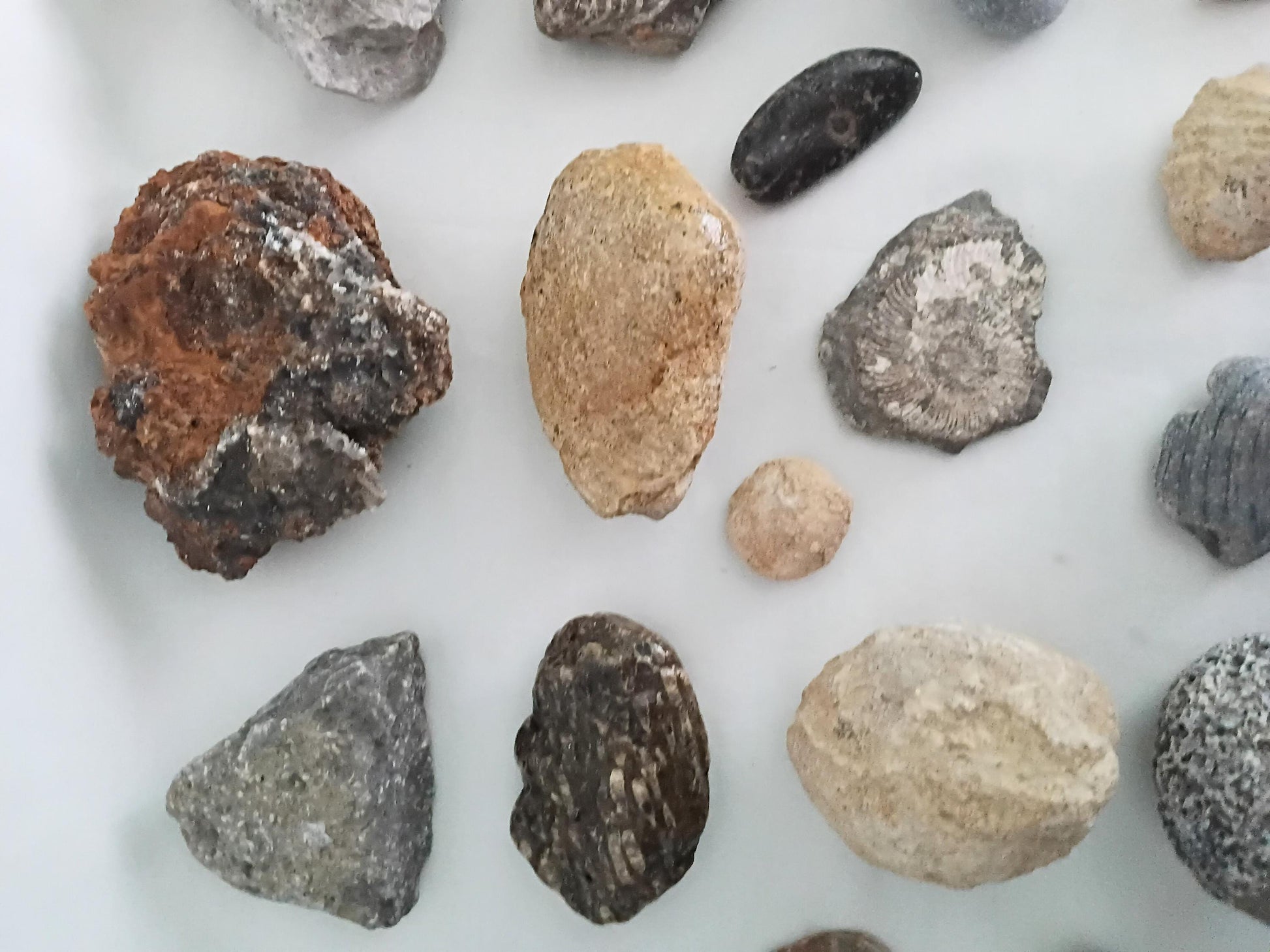 Lot of 20 hand collected UK fossils including bivalves, coral, brachiopod, ammonites, gypsum specimens, gryphaea, crinoidal limestone etc. Largest 9.5cm and smallest 2.7 cm. some of these have been varnished to enhance the detail.