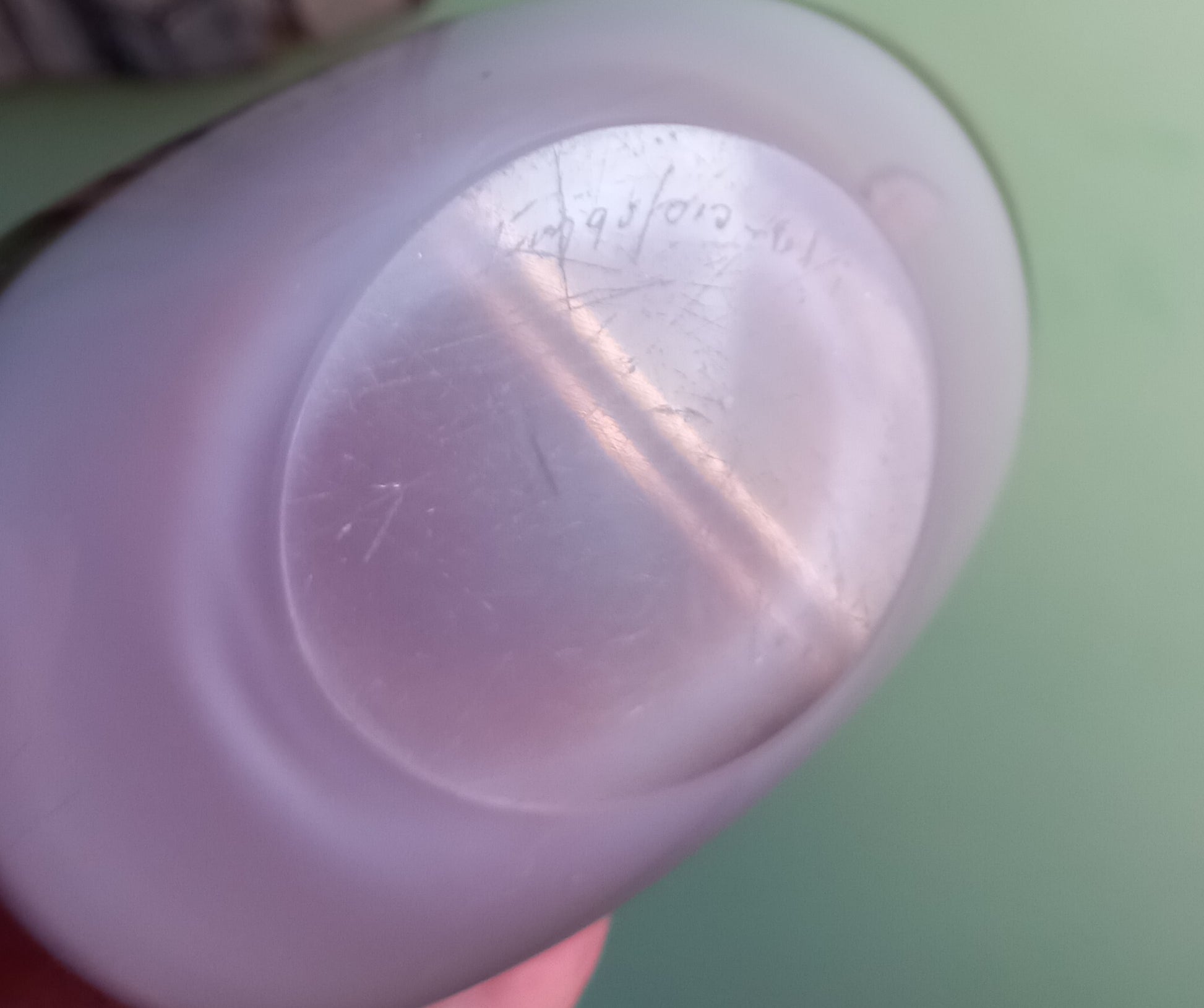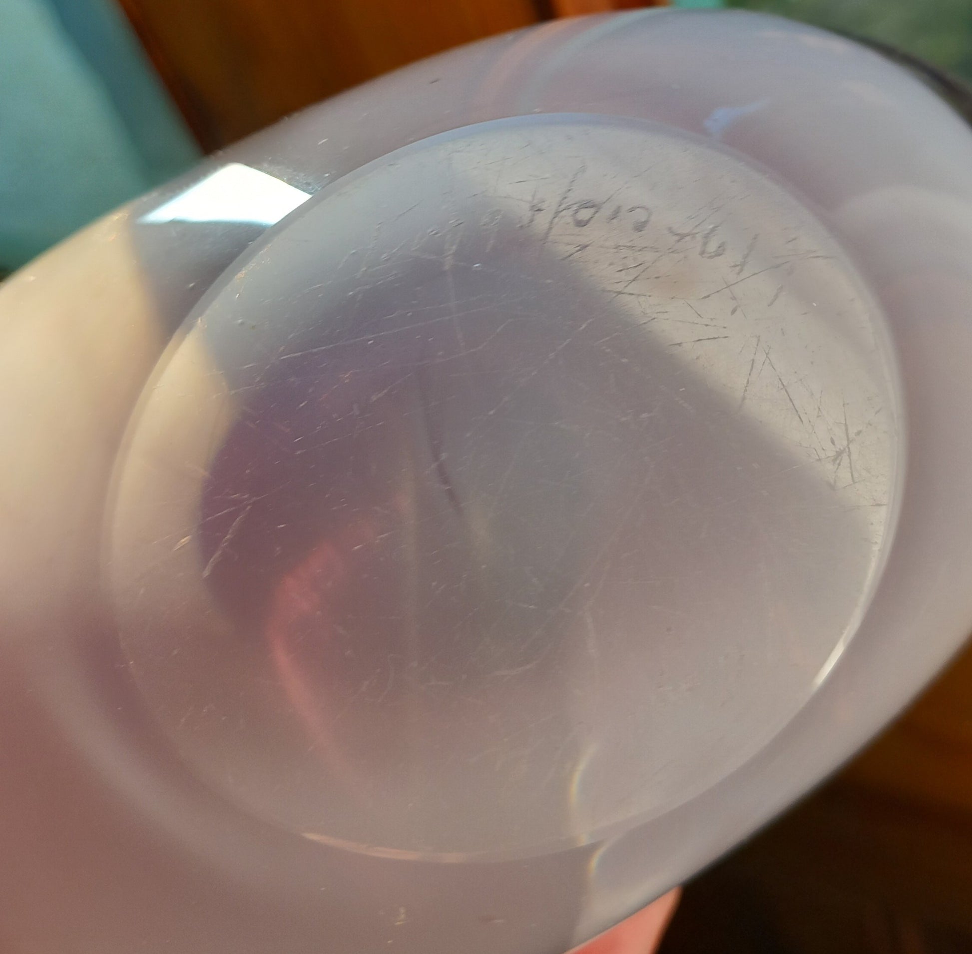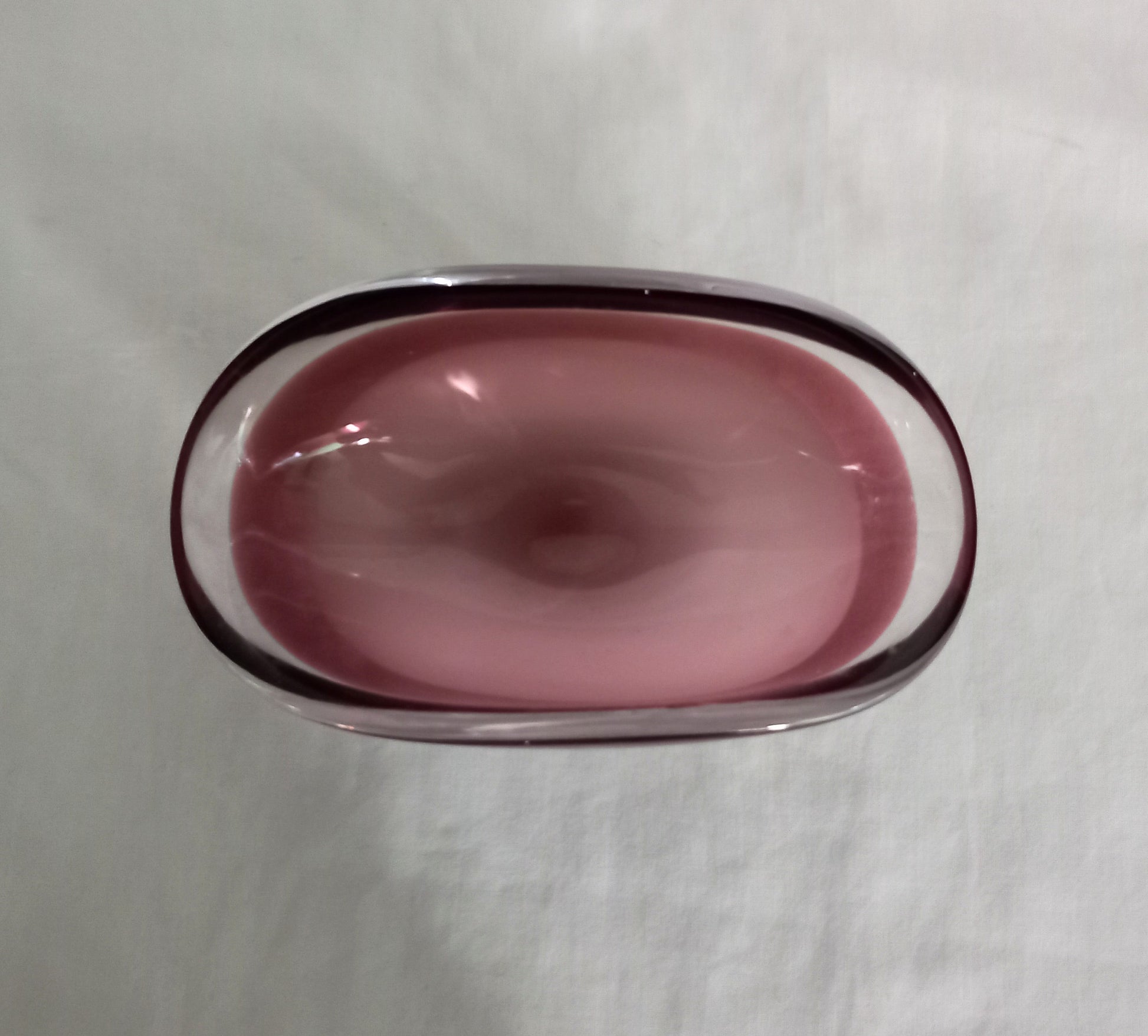 Mid Century Flygsfors Glass dish in purple & white, 3 inches tall and 5.25 inches wide. It is signed on the base 'Flygsfors 61'. Good condition with no chips or cracks.