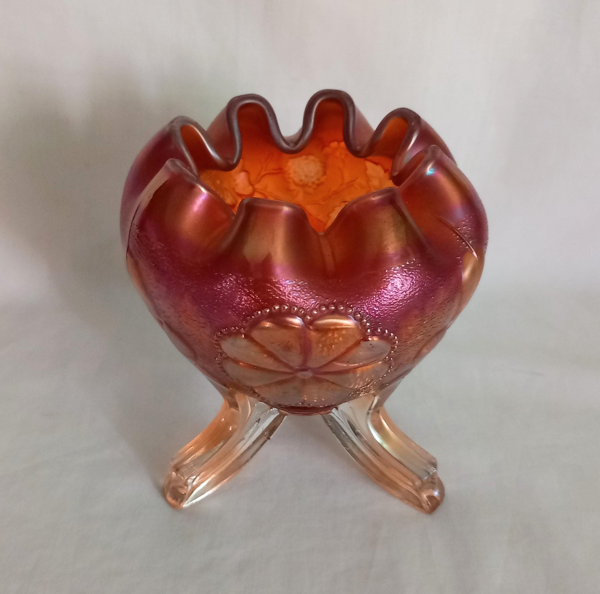 Northwood Marigold carnival glass daisy and plume pattern footed vase, 5.5 inches tall. This is marked on the underside. Good condition apart from a small chip to the underside of one foot.