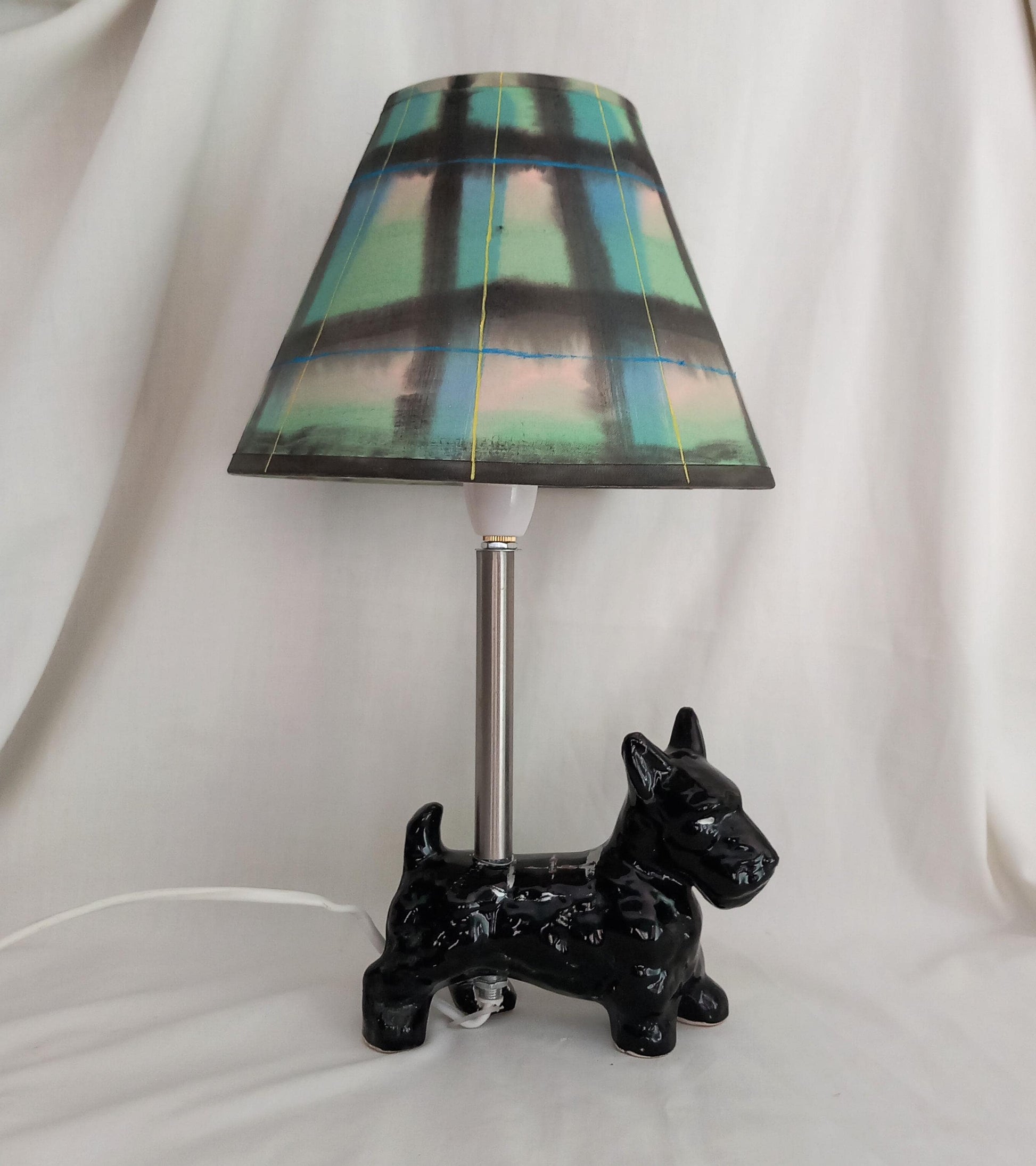 OOAK hand made Scottie dog table lamp with hand painted tartan design shade. The lamp is an upcycled piece made from a 1950s ceramic Scottie dog statue. It is 15 inches tall including the shade which is 8.5 inches.