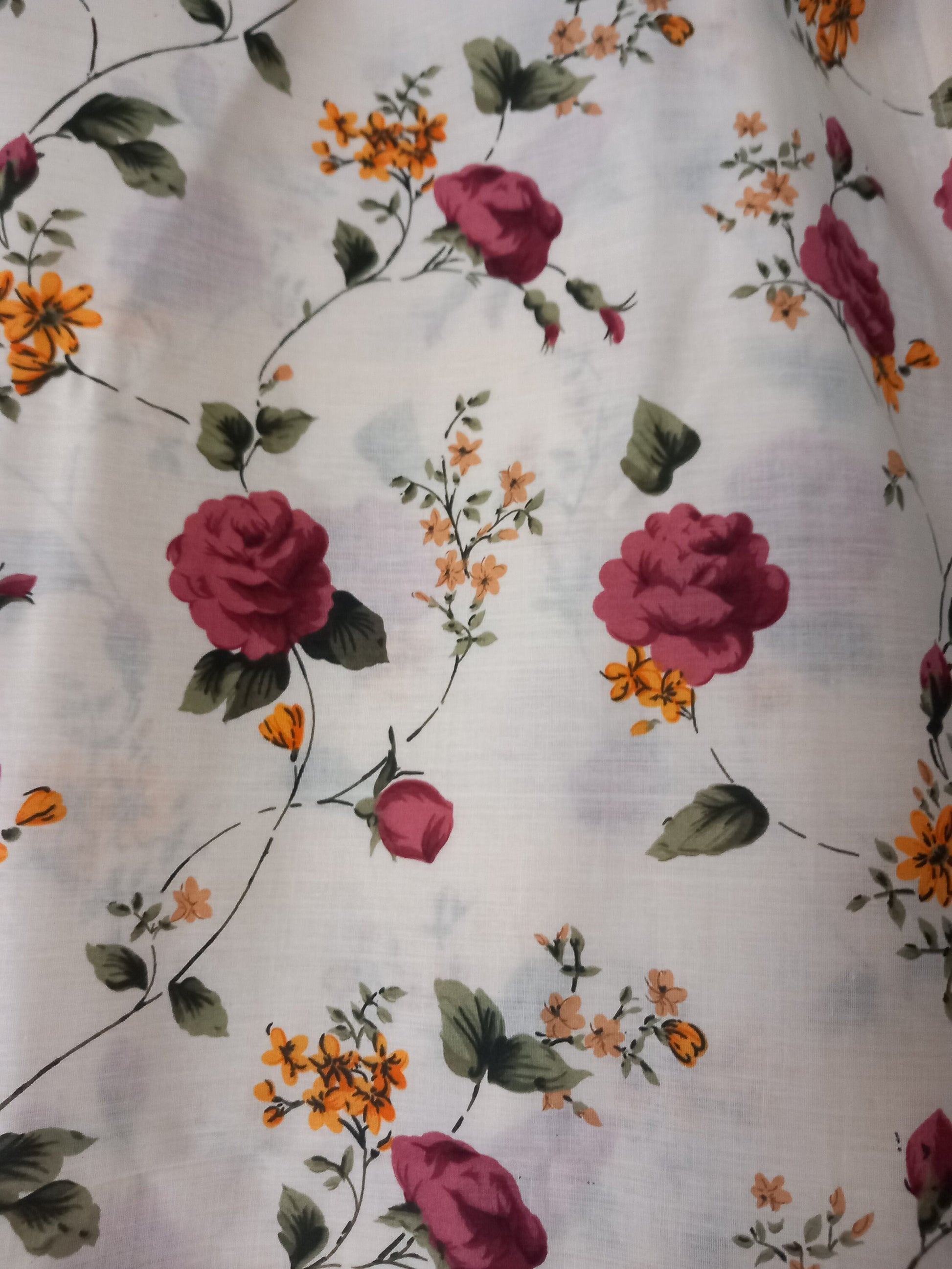 Pair of vintage lightweight dark red floral patterned curtains with tie backs, each panel 69 inches long and 64 inches wide. These look like they were never used but they have been stored for some years and there is an area of discolouration on the bottom of one curtain as pictured.
