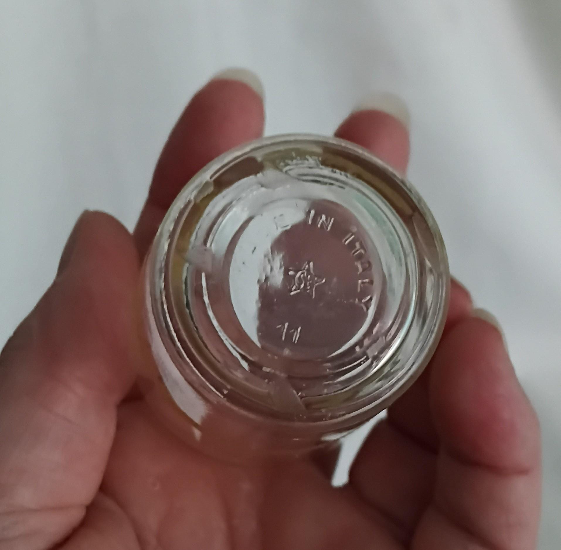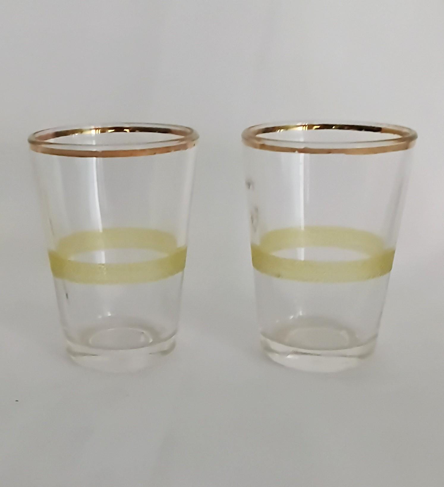 Pair of vintage 1950s yellow striped design shot or liqueur glasses, 2.75 inches. These are marked as made in Italy, both in good condition.