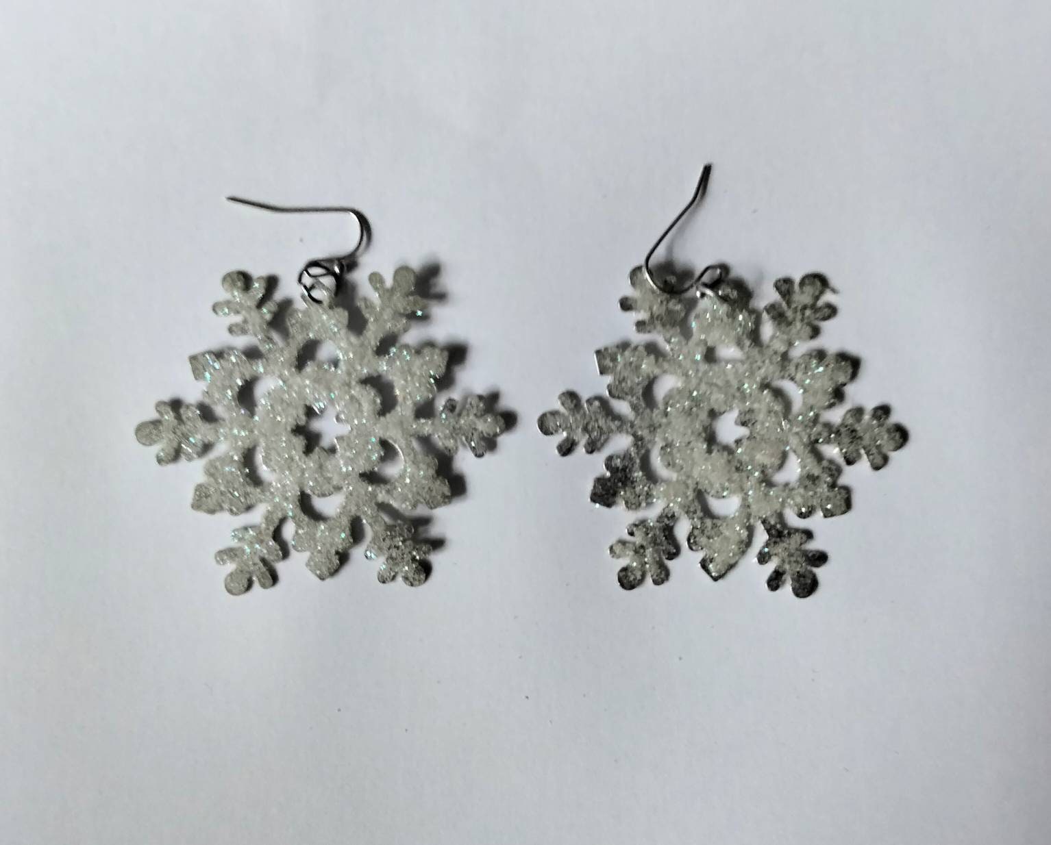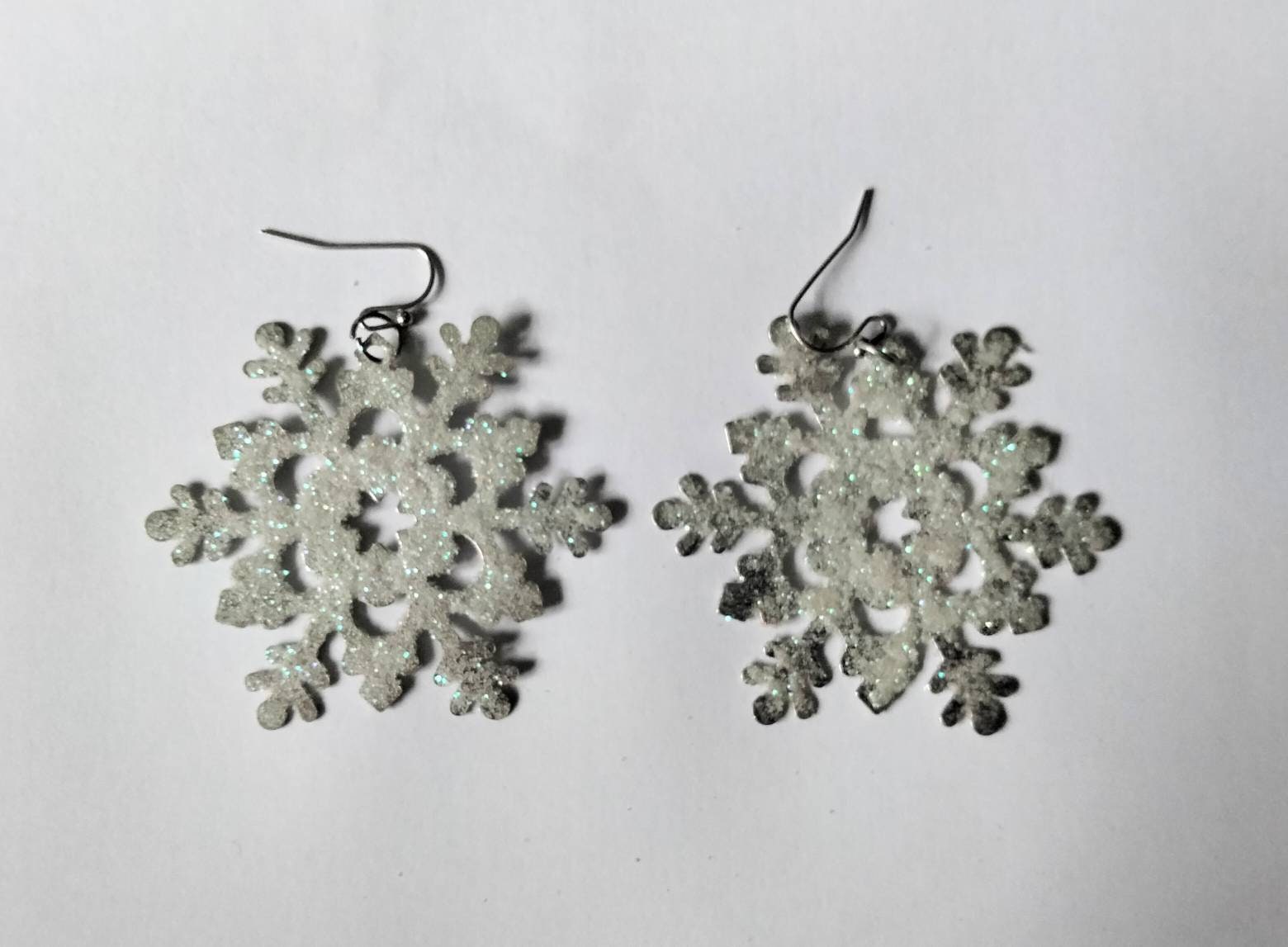 White & blue glitter snowflake dangly winter earrings