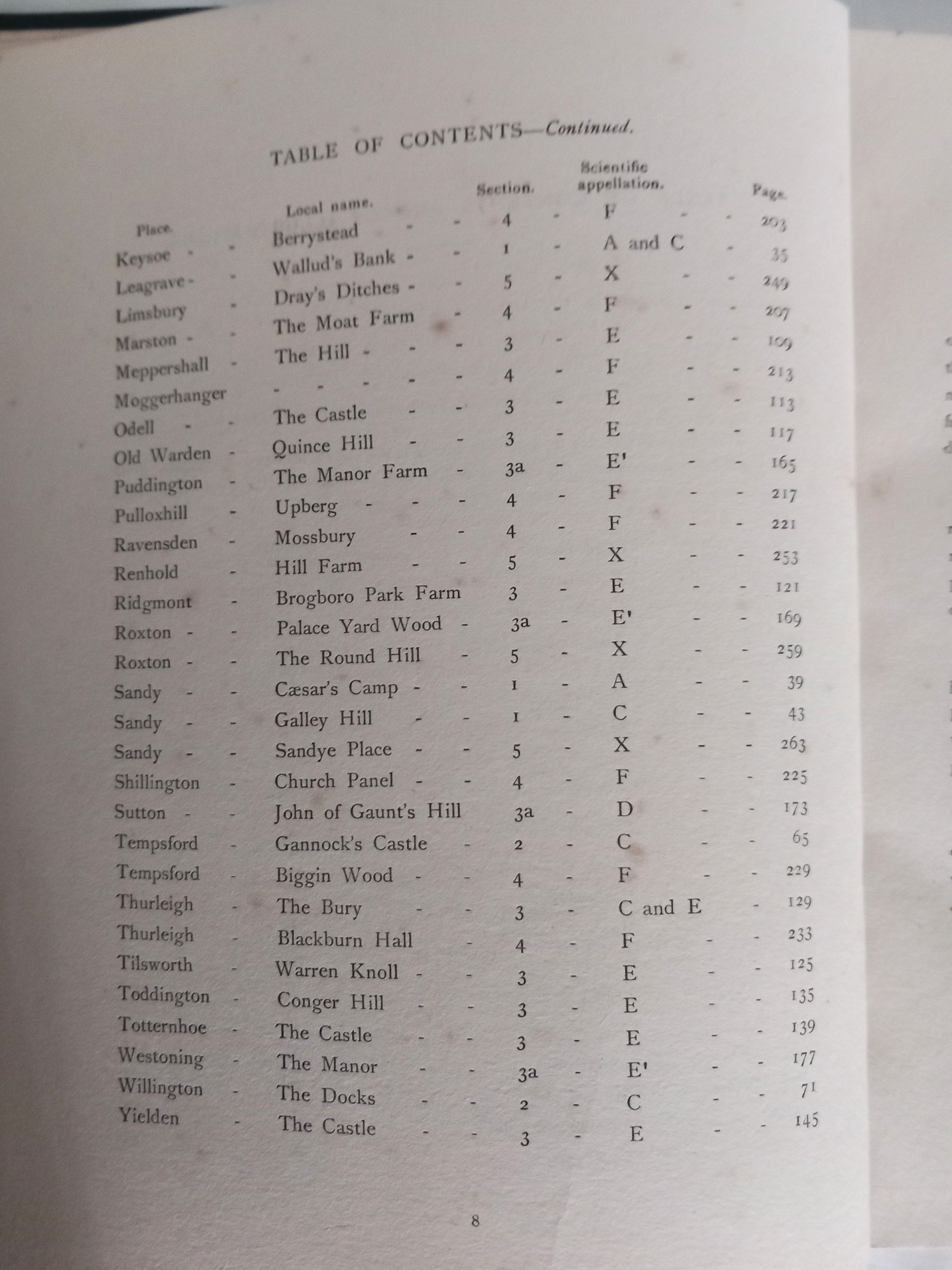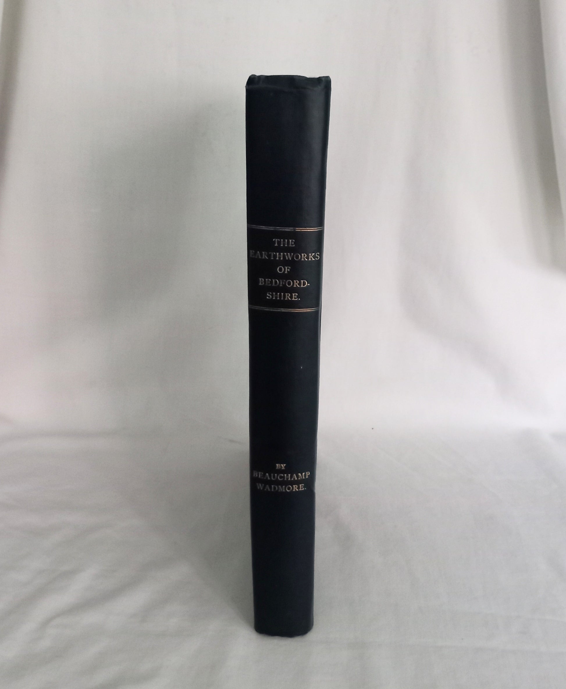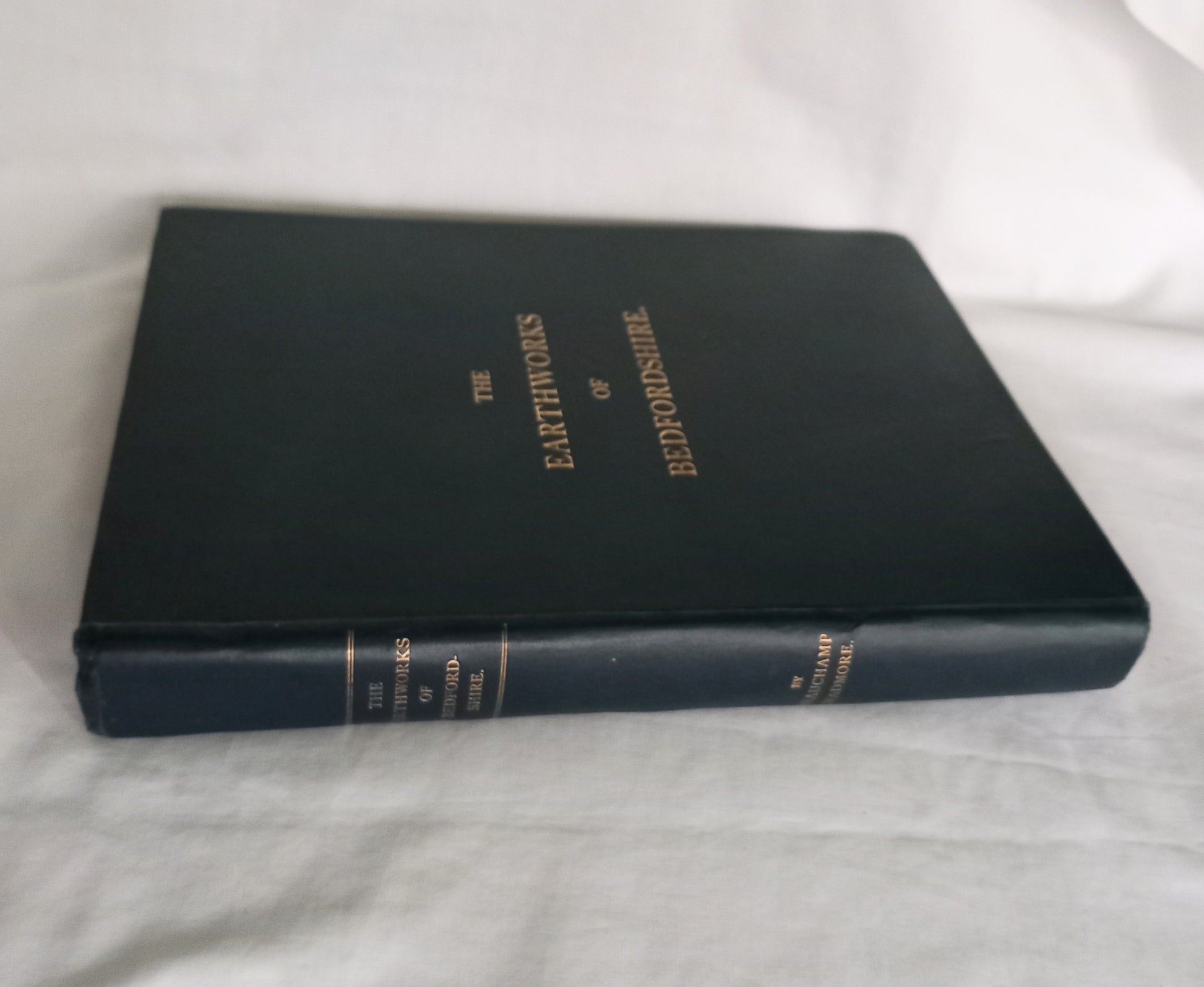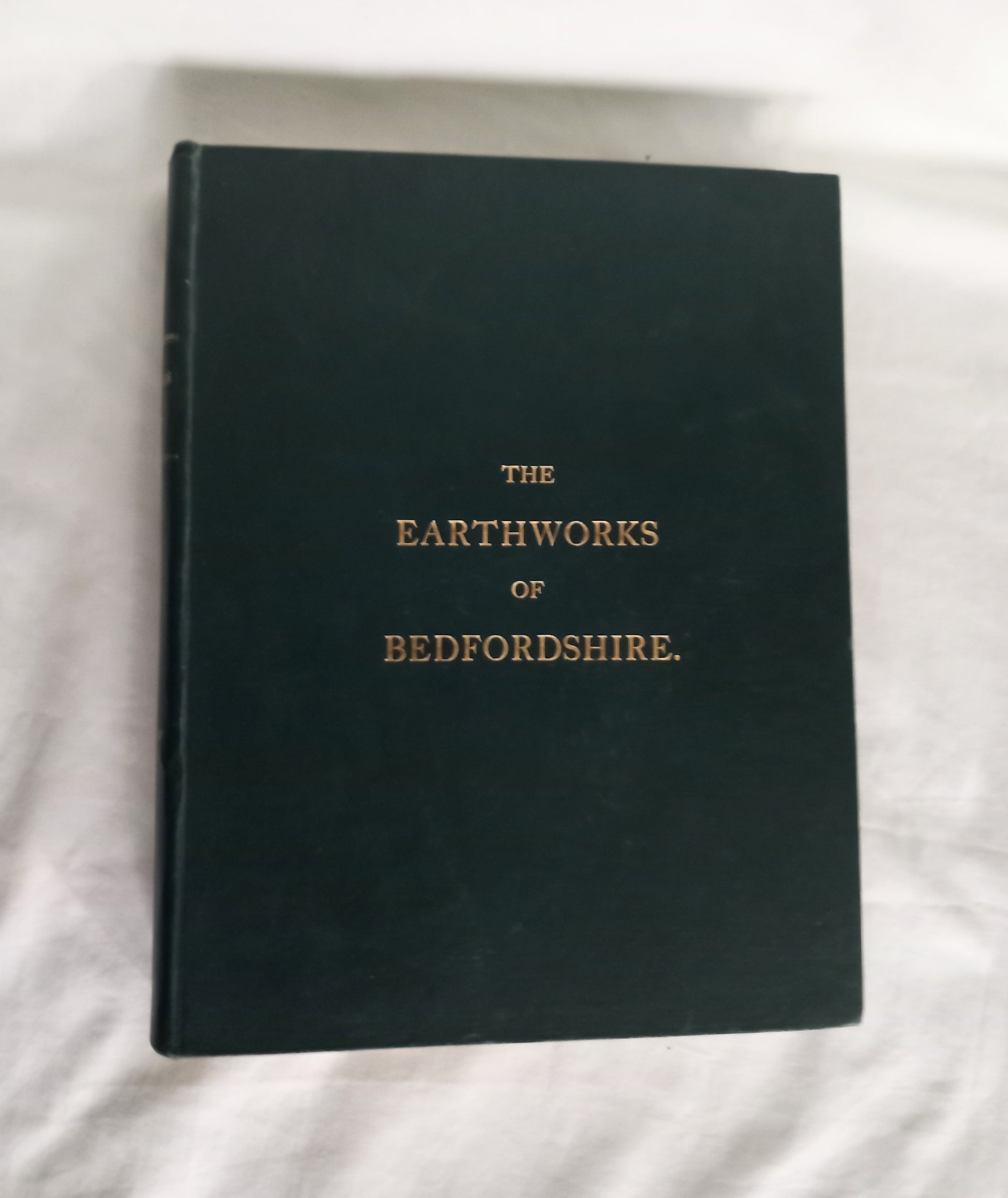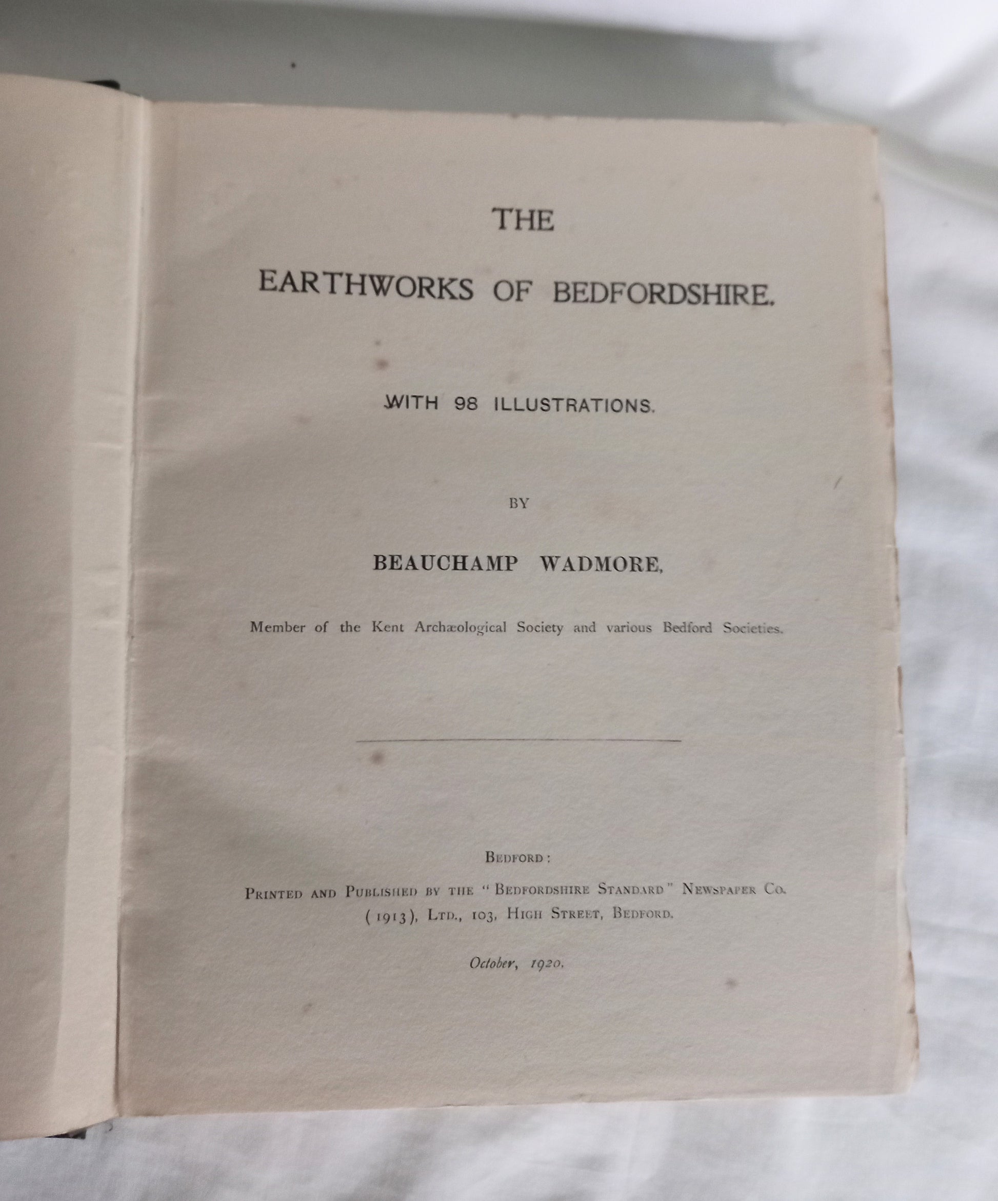 Rare book The Earthworks Of Bedfordshire by Beauchamp Wadmore, 1920. Large book with blue cloth binding and gilt lettering, illustrated throughout with diagrams and black and white plates. Good condition apart from yellowing and foxing to the pages.