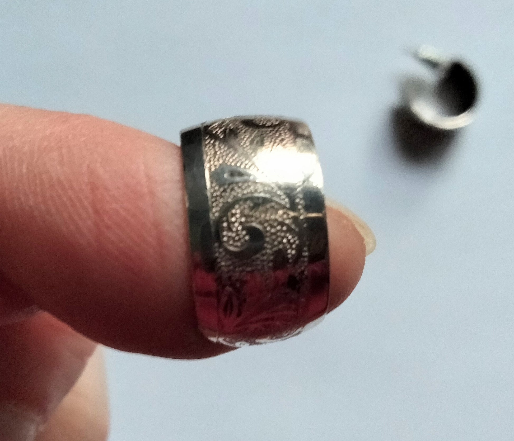 Real silver (unmarked) cuff earrings for pierced ears with engraved leaf design. 1.5 cm diameter and 1 cm wide. Good condition.
