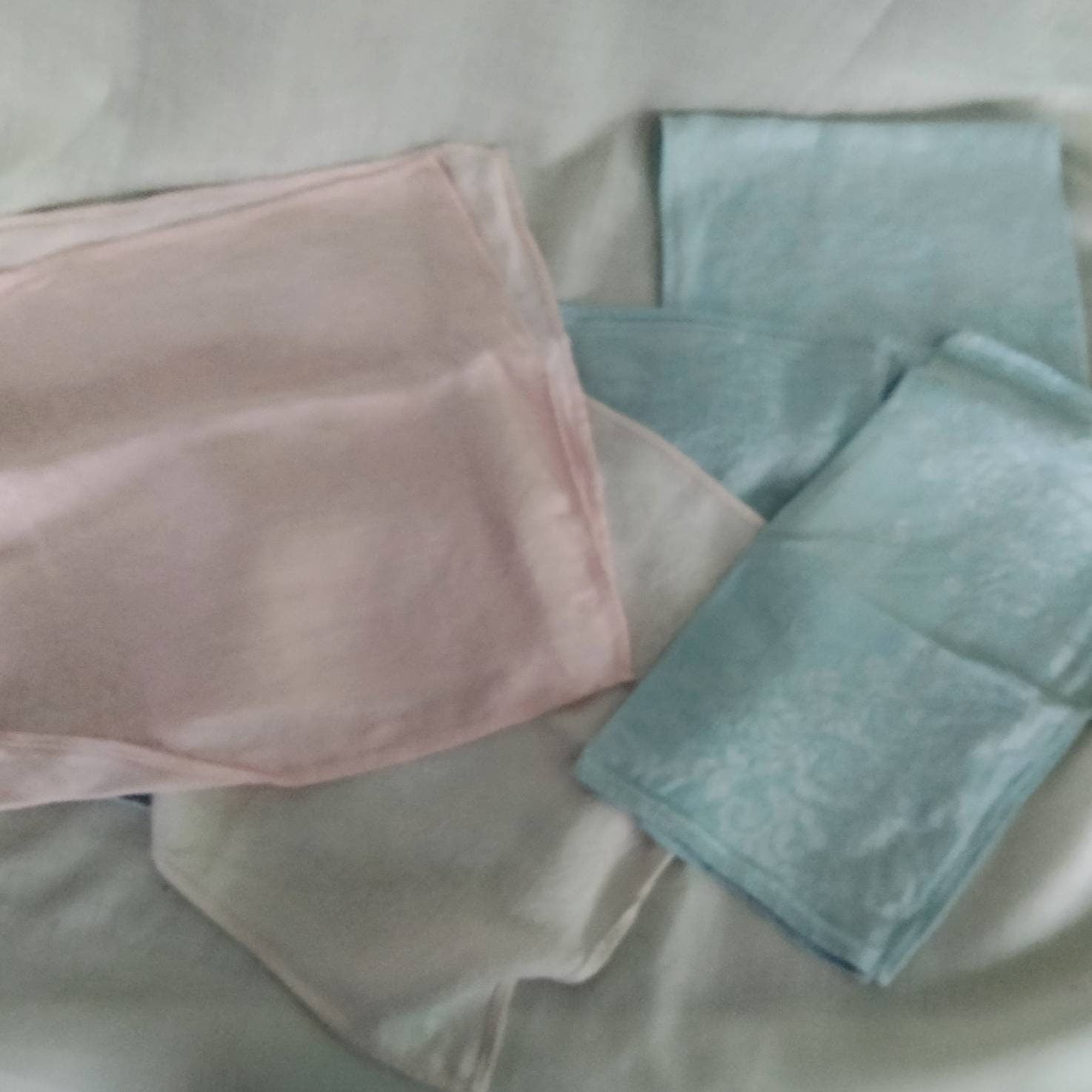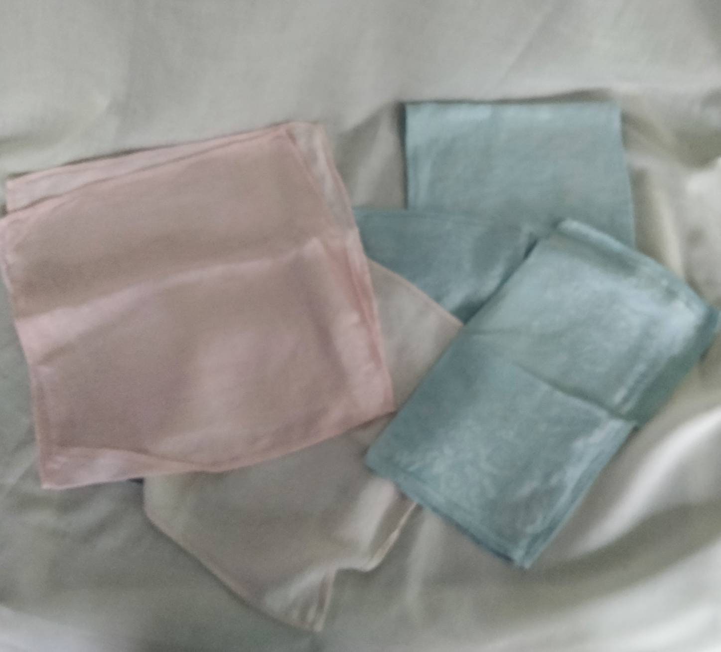 Vintage napkins, 3 pink and 2 blue 10.5 inches and one blue 14.5 inches. Good vintage condition.