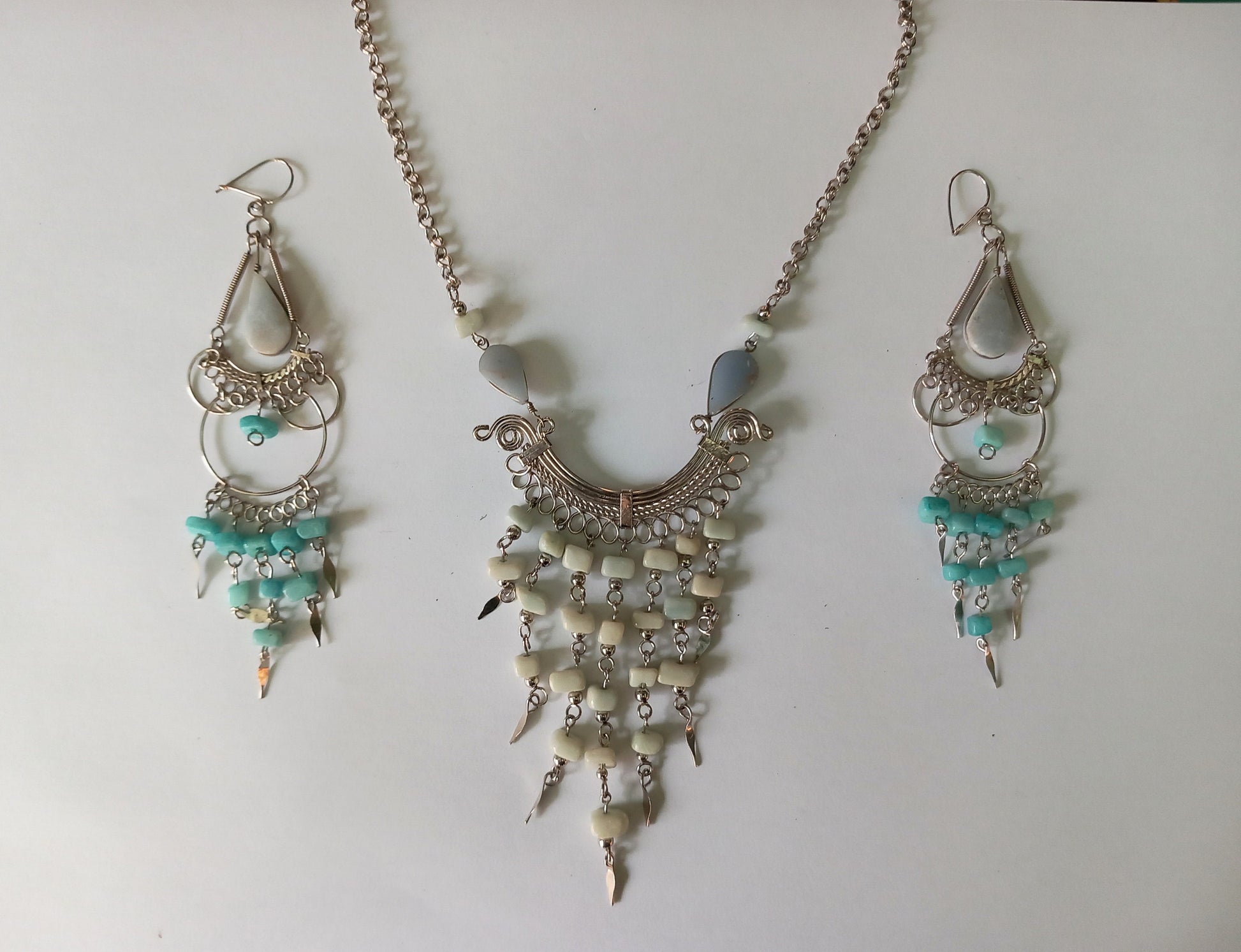 Silvertone Indian wire & blue semi precious stone chip necklace & two tone earrings set. Necklace 17 inches and 3.5 inch drop. Earrings 4.5 x 1.25 inches. Good condition.