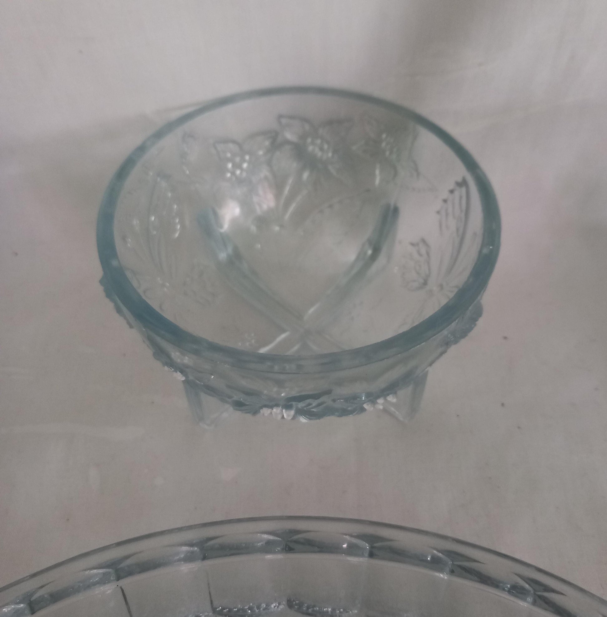 Sowerby art deco blue butterfly pattern pressed glass pair of candle holders, vanity tray and trinket pot (no lid). All in good condition with no damage apart from a chip to the rim of the tray.