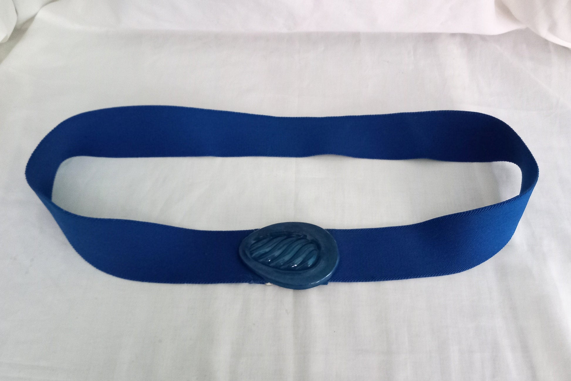 True vintage 1980s blue waist cinch belt with teardrop clasp. The elastic has perished on the band and so the belt is now a large size and measures 40 inches. It would be easy to add new elastic to change the size. It is 2 inches thick.
