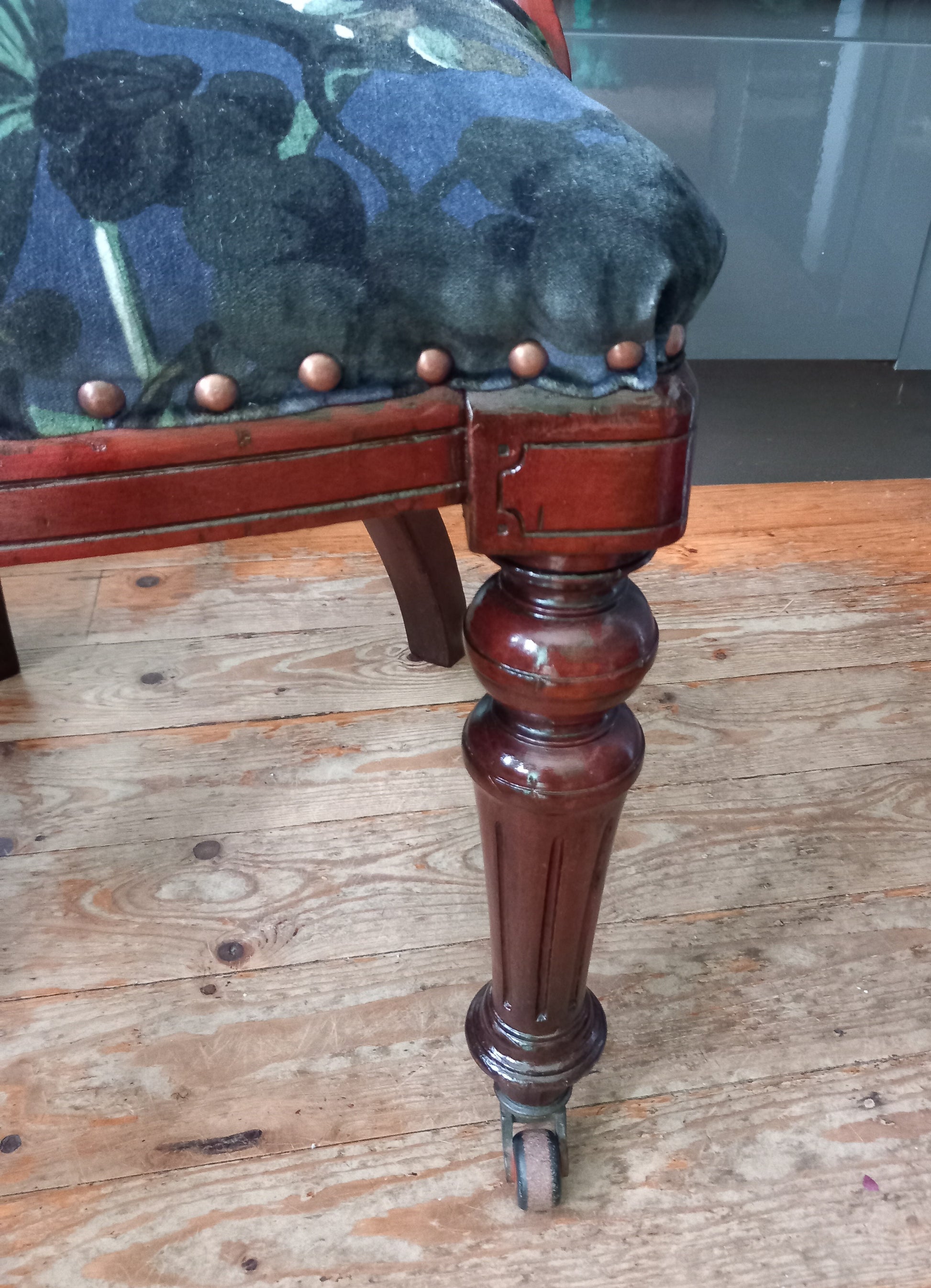 Antique Victorian mahogany wood chair with decorative front legs with original casters. This has been reupholstered with House of Hackney velvet Limerence fabric and finished with antique copper coloured upholstery nails, 18.5 inches wide, 17 inches deep and 34 inches tall. It has all new internal materials making it compliant with modern fire regulations. This is showing some scars to the wood from previous upholstery and there is visible stitching behind each side of the backrest where the fabric has been sewn into shape. It also has a very old repair to the left hand side of the backrest.