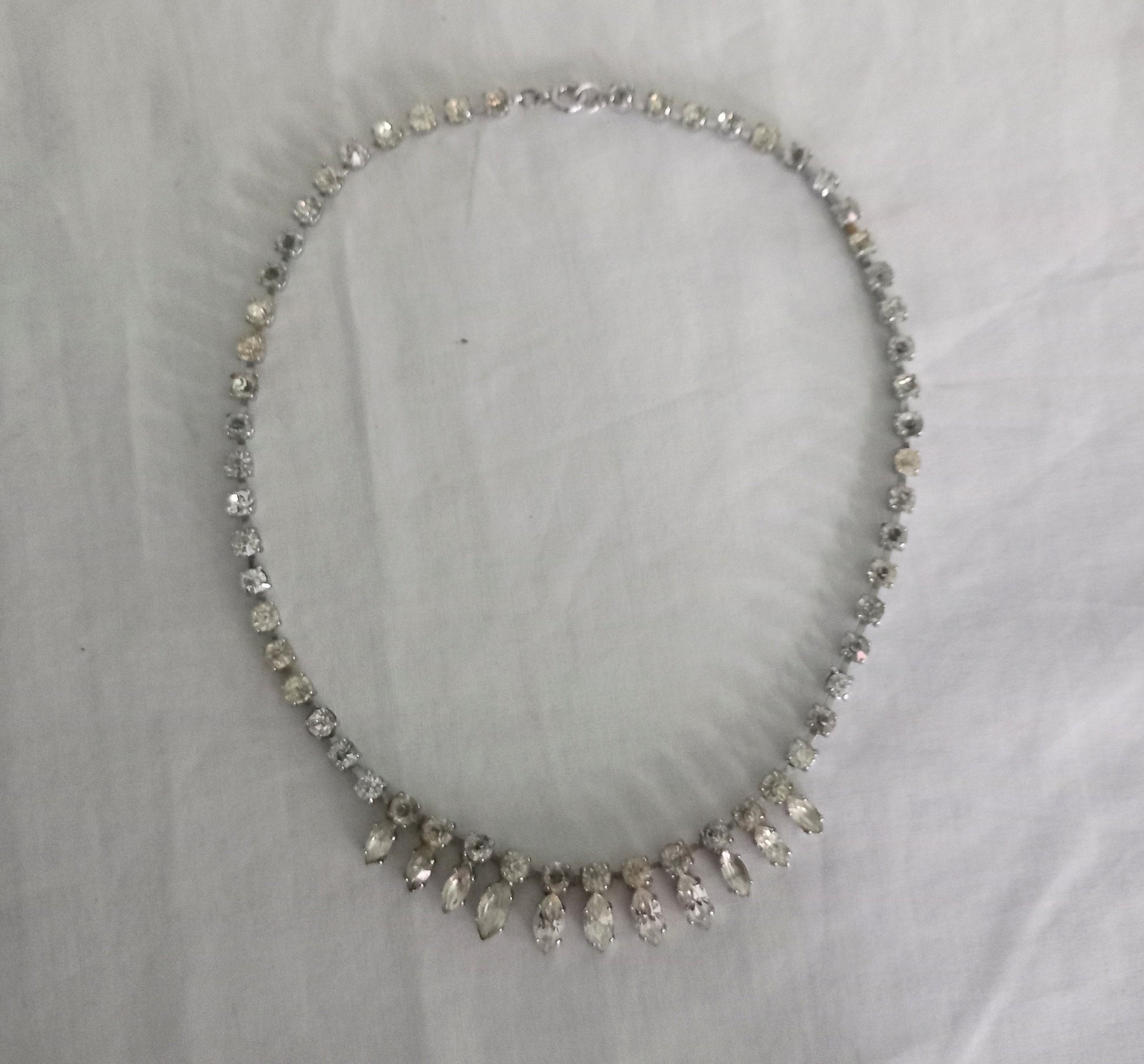 Vintage 1950s silvertone & Clear All rhinestone central detail Claw Set necklace. 15 inches from end to end, good vintage condition apart from some slight yellowing to some stones.