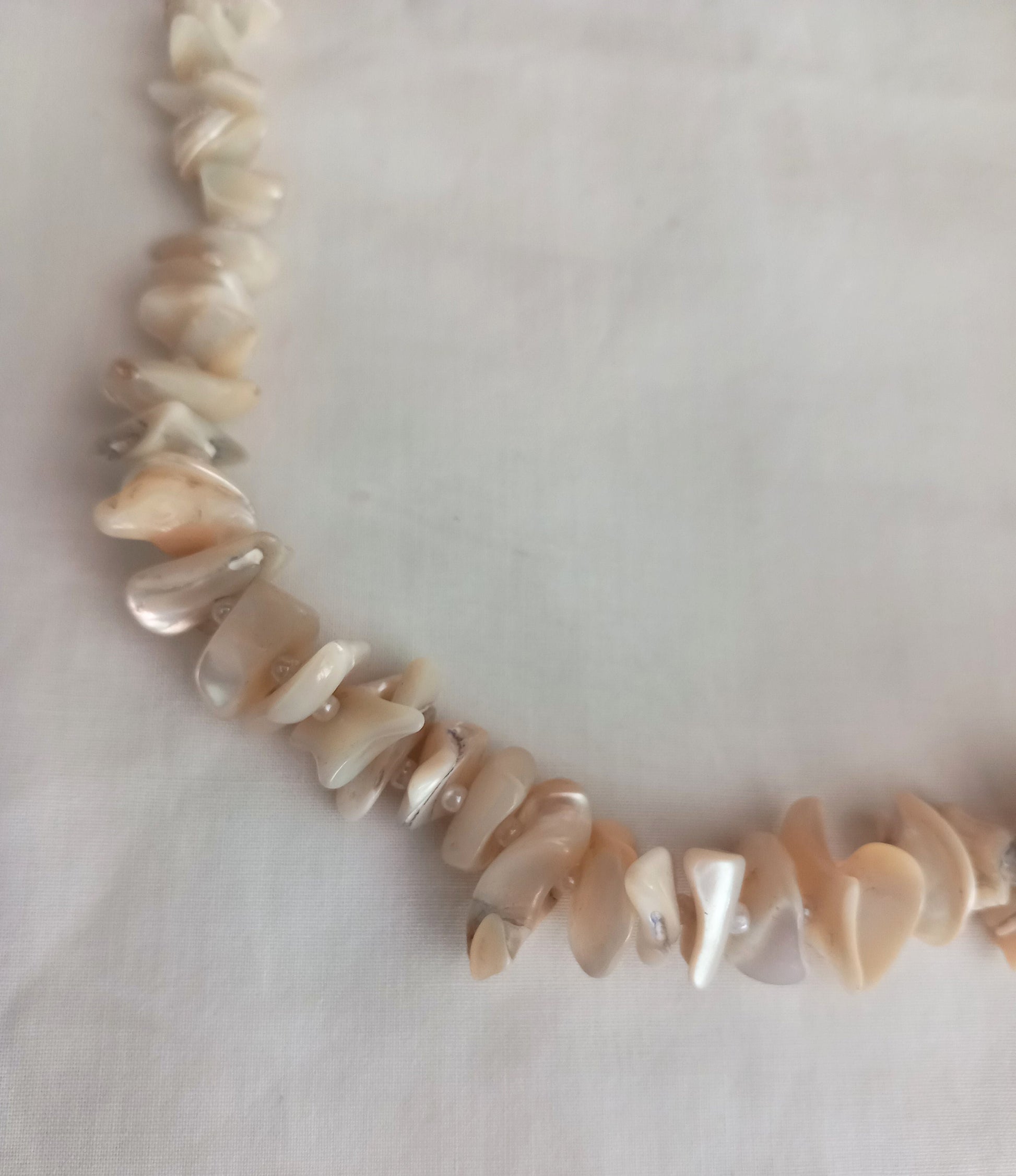Vintage 1960s white mother of pearl semi precious stone chip bead necklace with decorative clasp. 19 inches from end to end and 2 cm at the widest point. Good vintage condition.