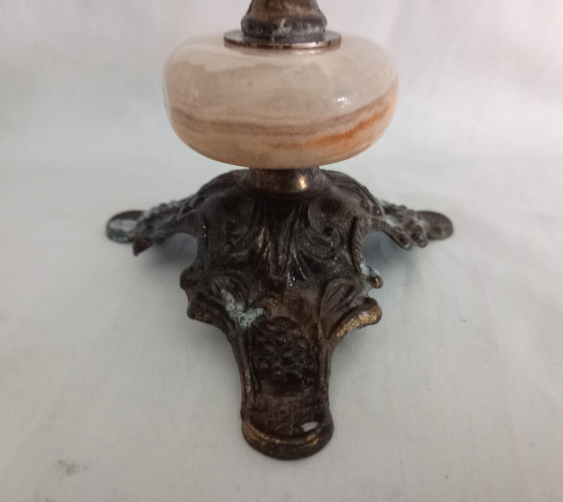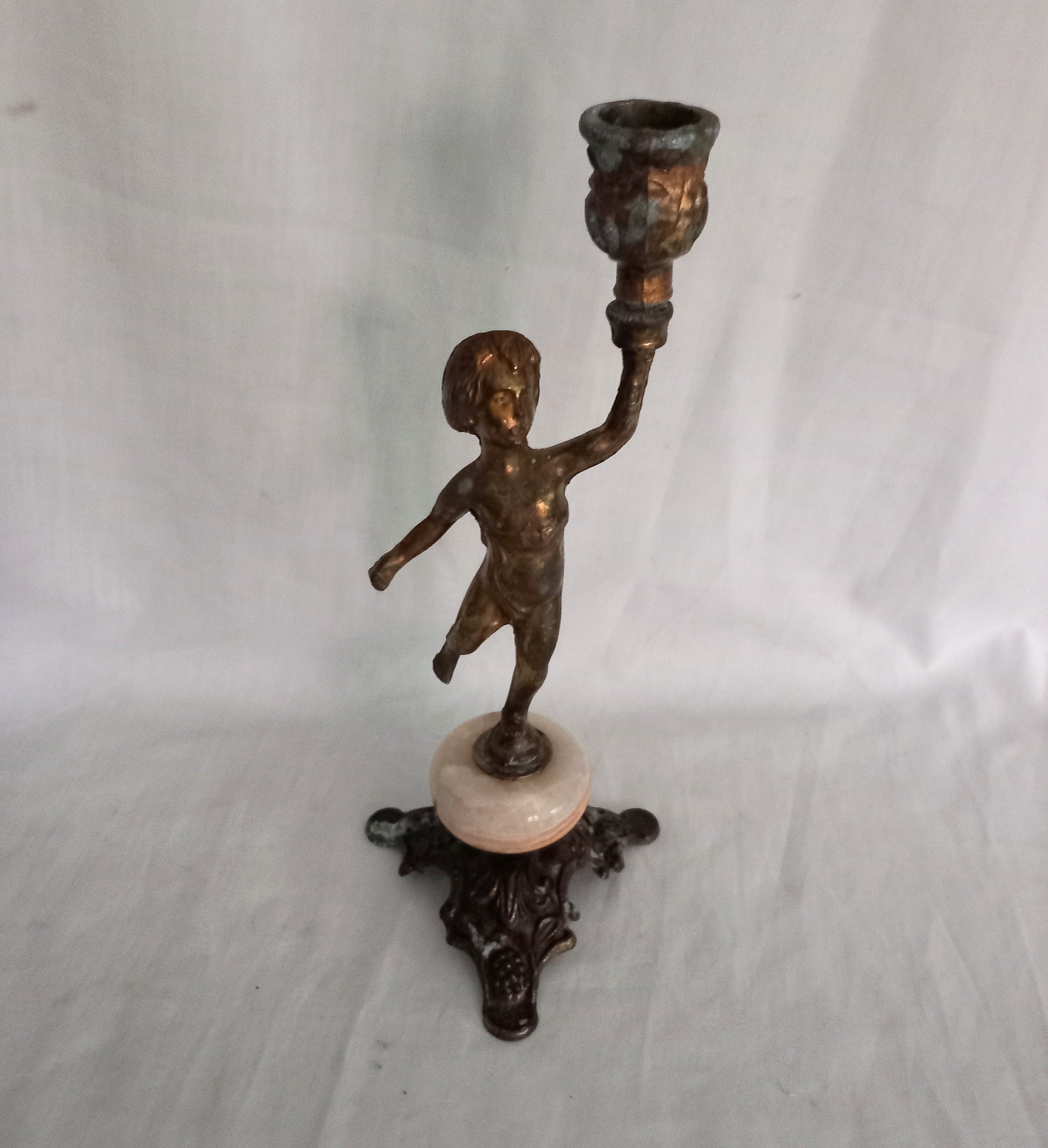 Rococo style cherub design candlestick in brass with onyx stone detail, 9.75 inches. This is marked as being made in Italy. Good condition showing minor wear.