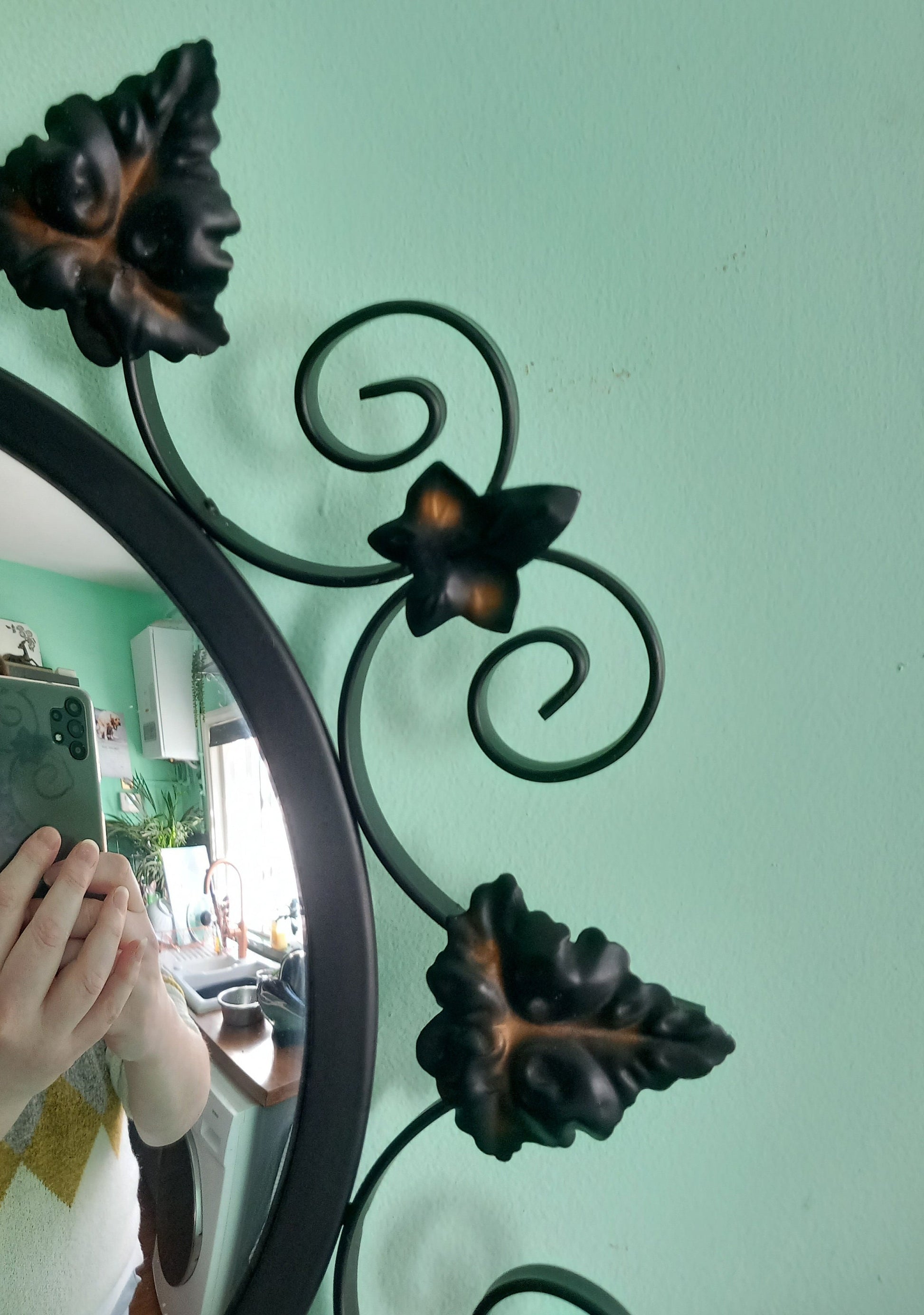 1970s Black Curled Metal Leaf Design Convex Wall Mirror 17.5"
