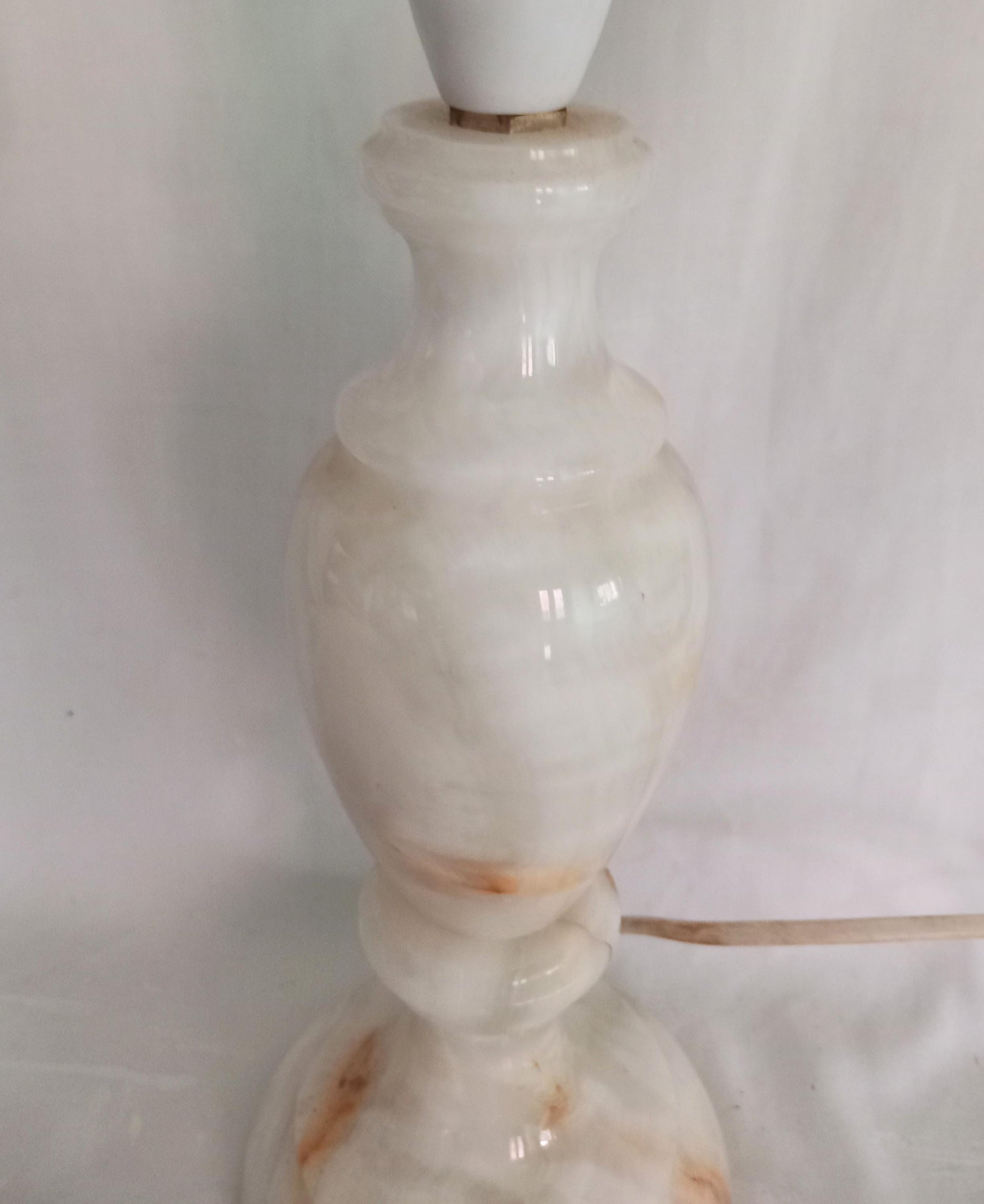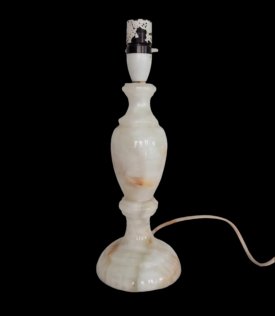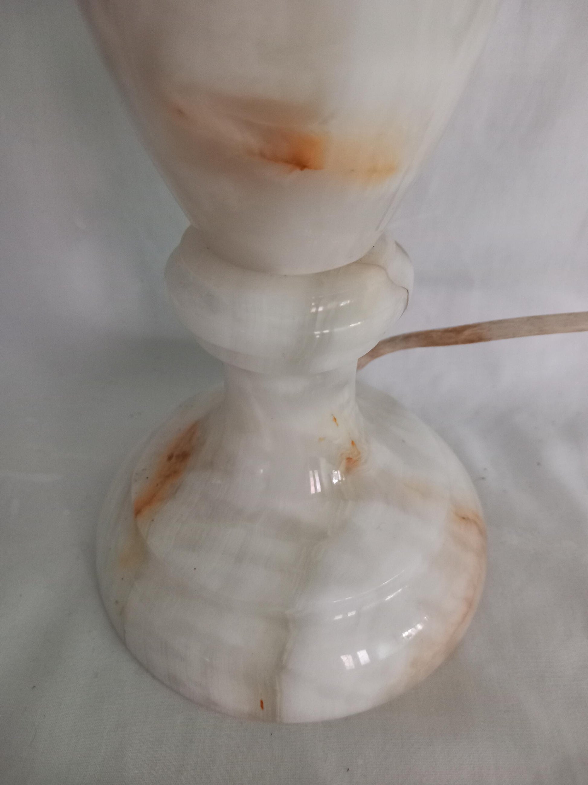 Vintage 1970s green & orange onyx stone table lamp. In working order and PAT tested to expire May 26. Approx 13 inches tall. Good condition apart from a crack near the base as pictured (last photo).