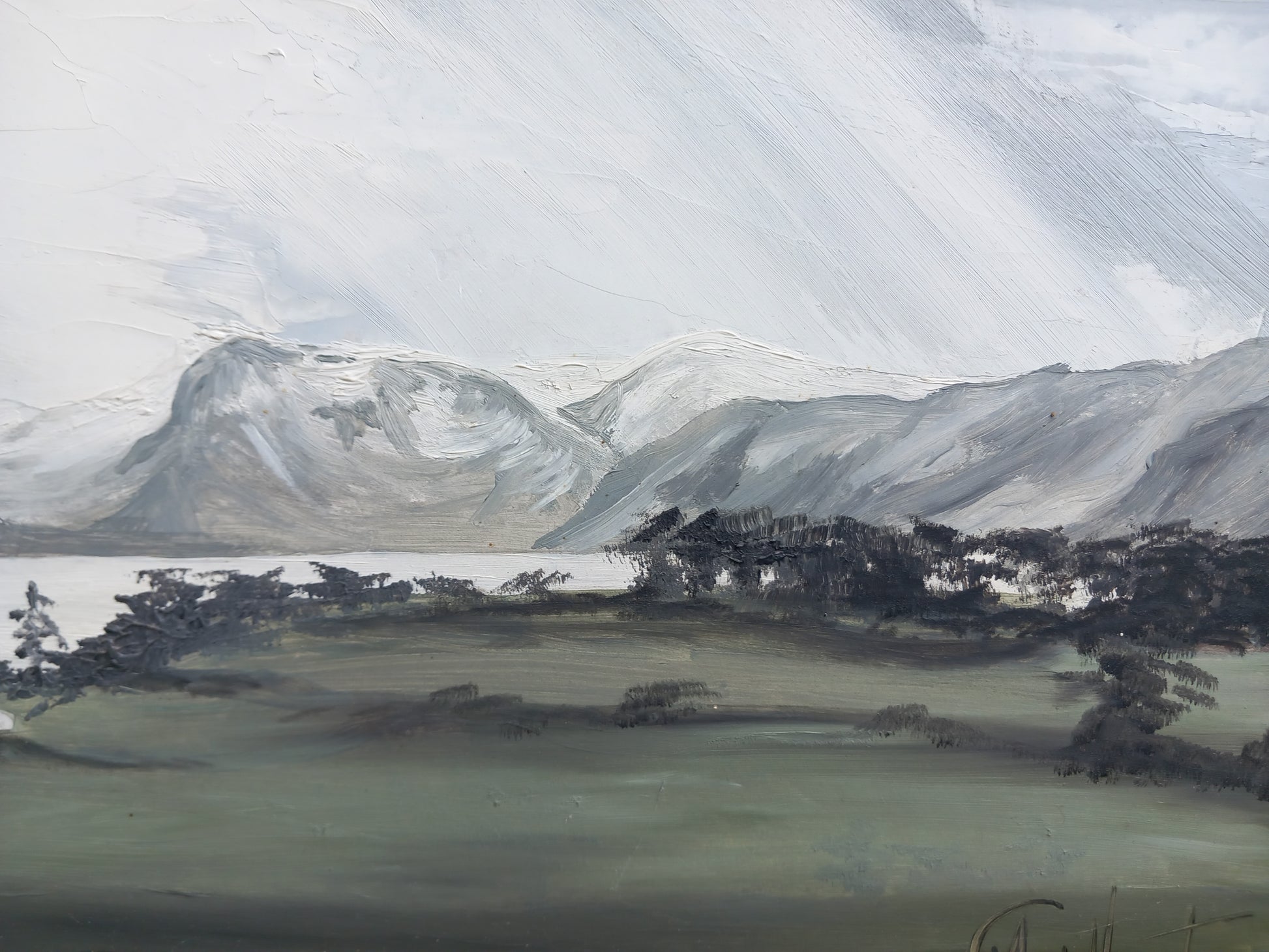 1970s oil painting of moody grey mountains & lake in wood frame 27.5"