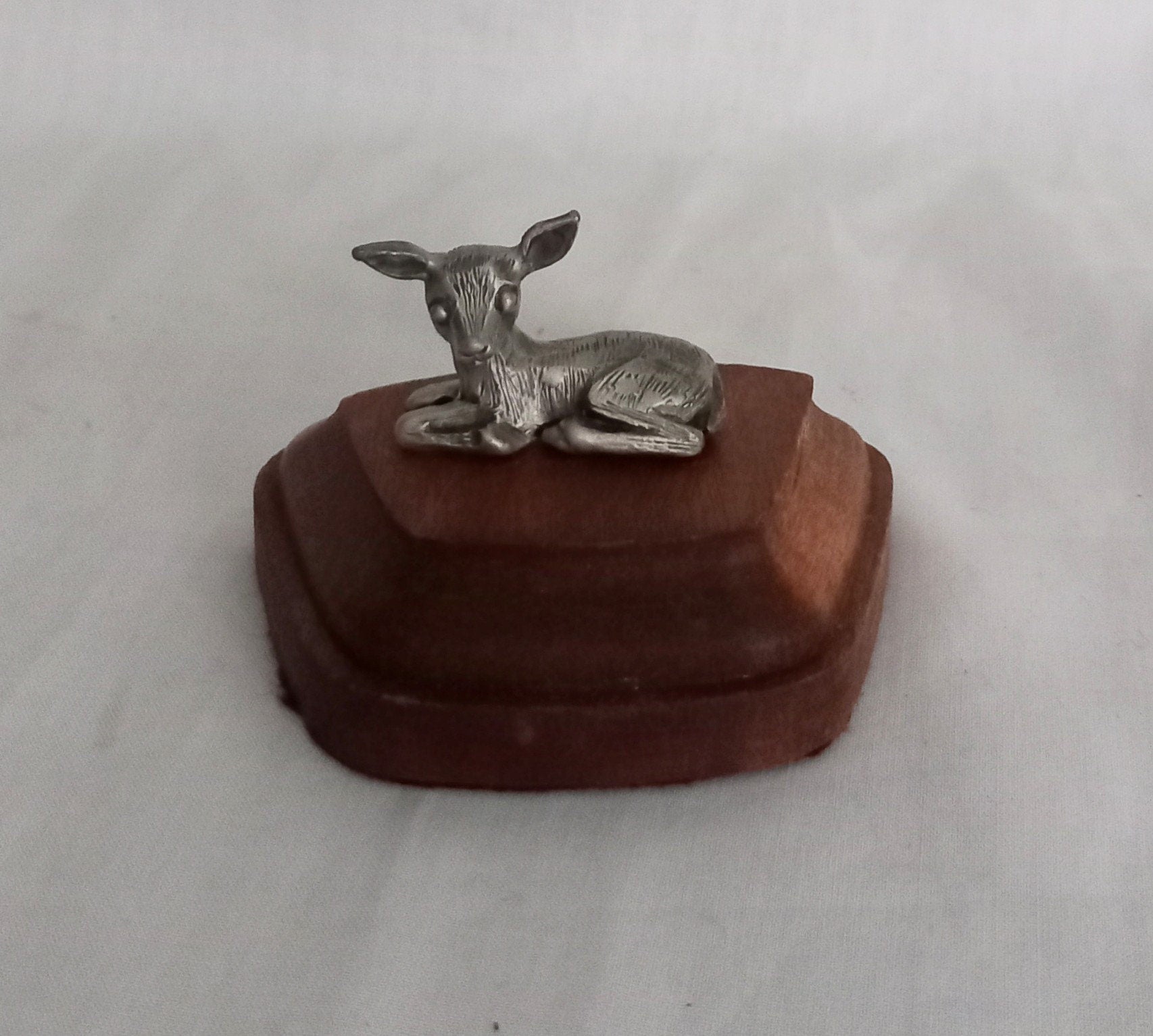 Vintage 1970s small silvertone metal deer statue on wooden base, 6.5 x 5.5 x 4 cm. Good condition showing minor wear.