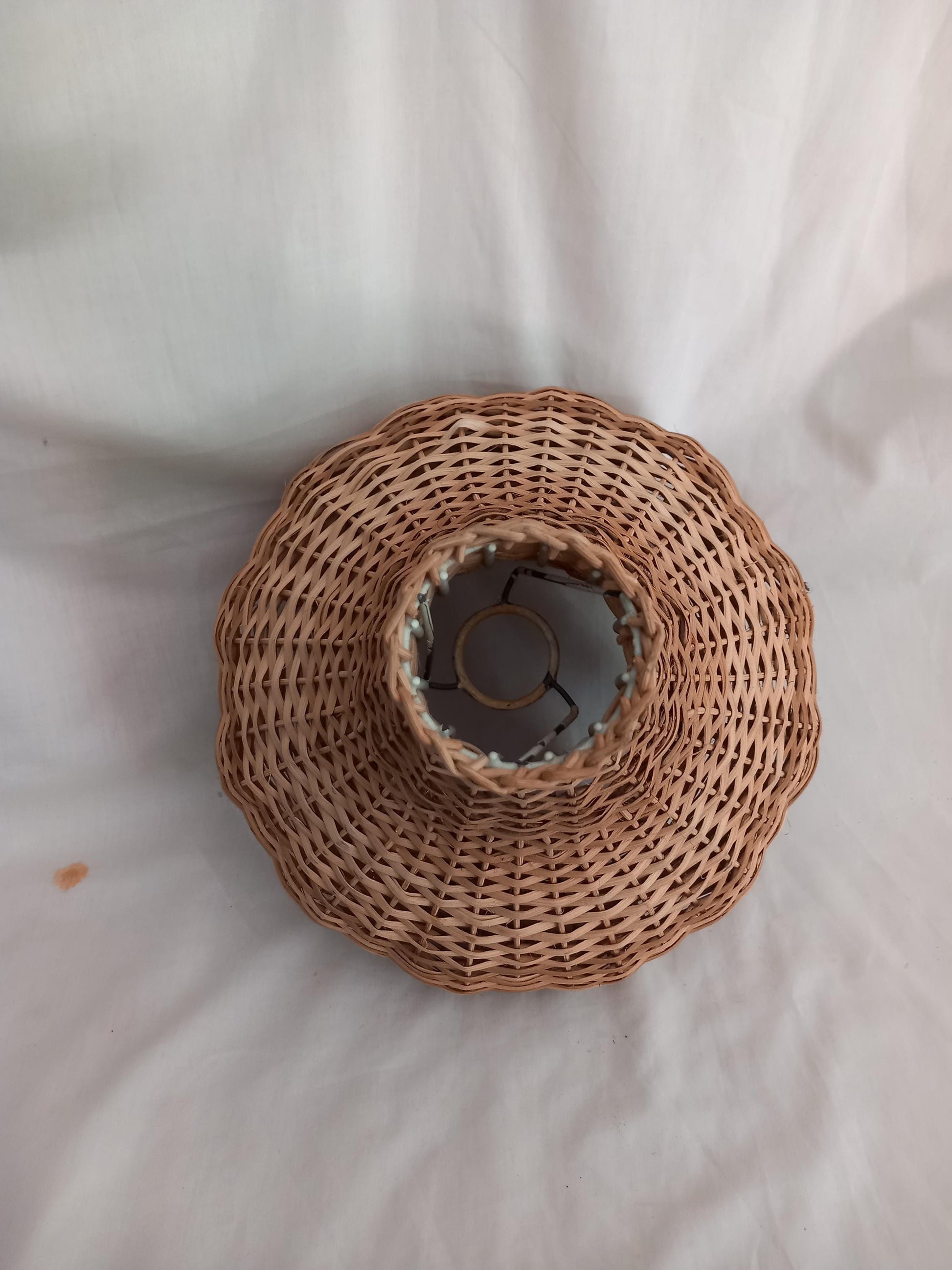 Vintage Mid Century tiki style wicker gourd shaped pendant light shade, 13 inches tall and 10.5 inches wide. This is in fair vintage condition but has some splits to the wicker and scuff marks as pictured. It still displays well.