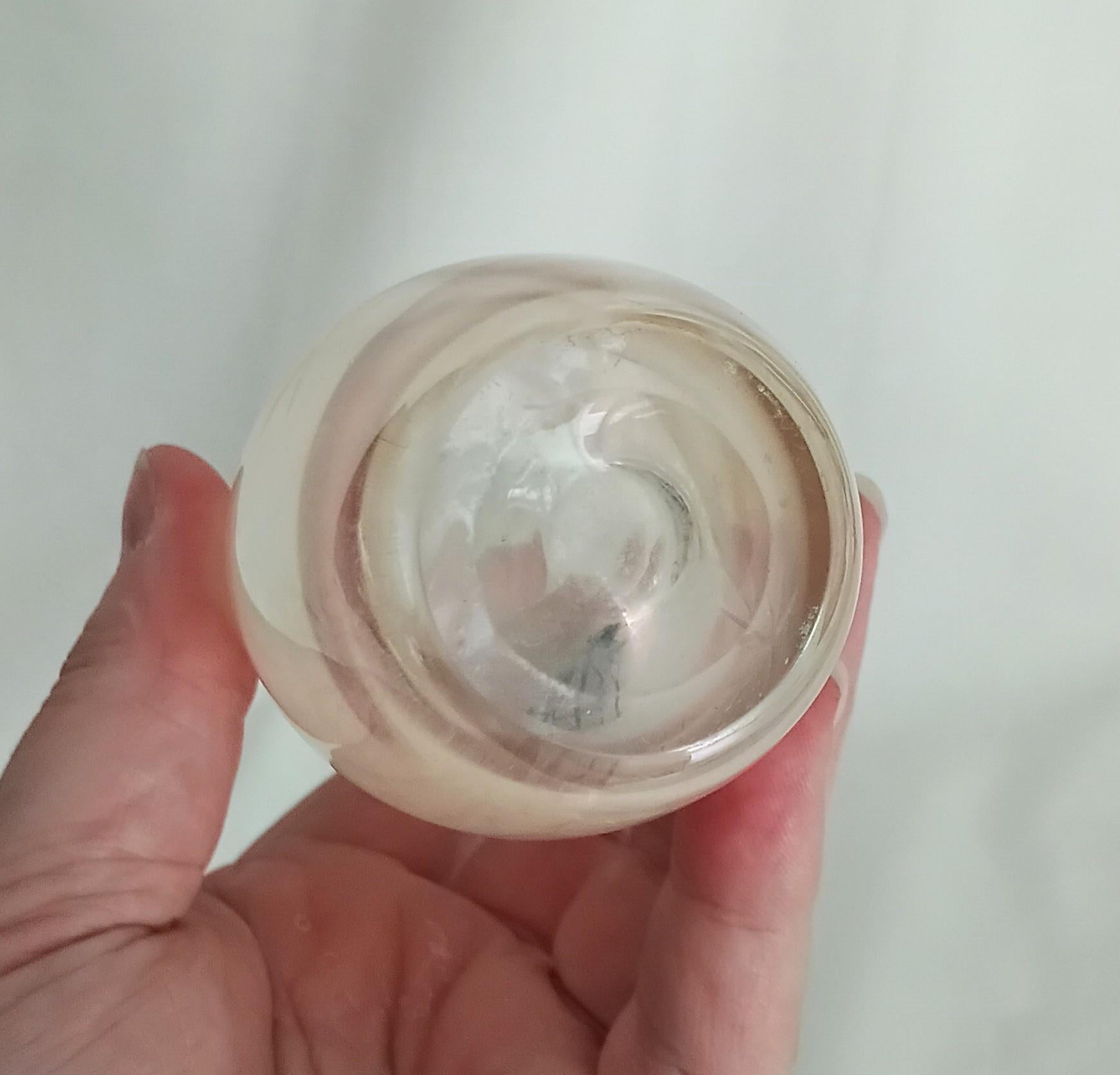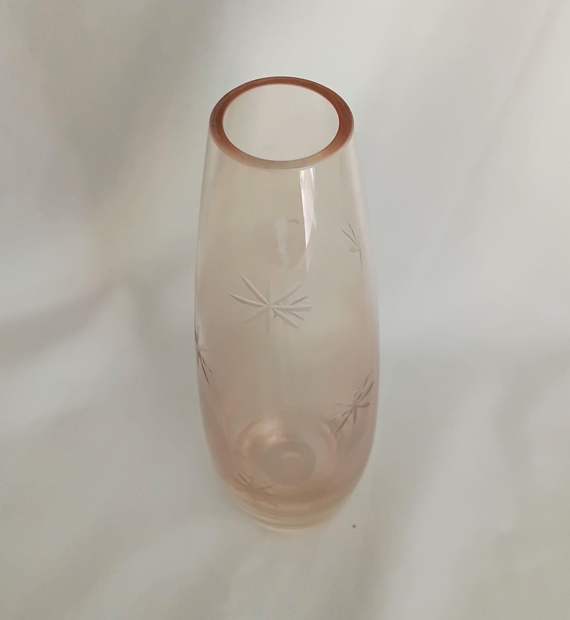 Vintage 1990s peach lustre finish glass vase with cut star design, 7 inches tall. Good condition with no chips or cracks.