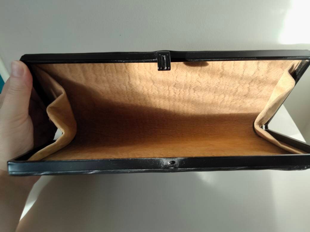 Approximately 11.75 X 5.5 X 1.75 inches, brown velour interior. Good vintage condition showing minor wear.