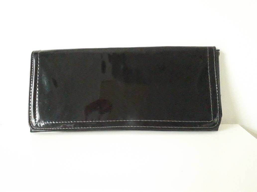 Approximately 12 x 5.5 x 1 inches. Black fabric interior with zip pocket. Good vintage condition showing a little wear.