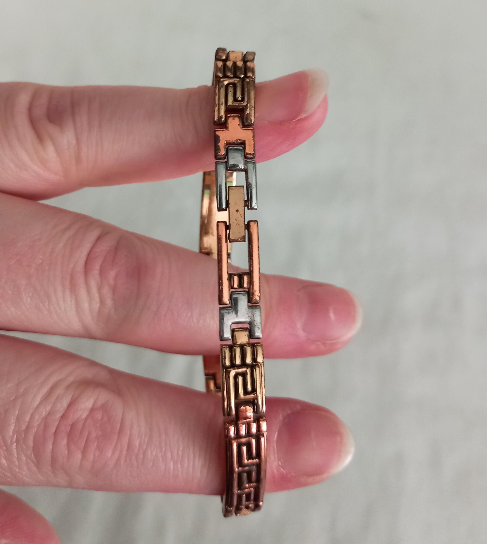 Vintage 1980s gold plated tricolour Greek Key chain link bracelet, 18.5 cm long and 0.7 cm thick. Good vintage condition showing a little wear.