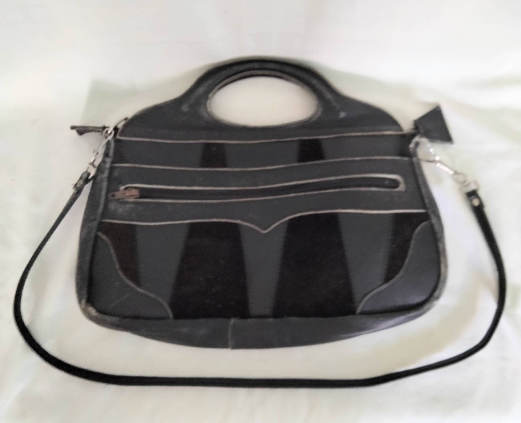 Real leather with real suede triangles design. Approximately 13 x 10 inches with one pocket and detachable shoulder strap. Good vintage condition showing wear to the leather.