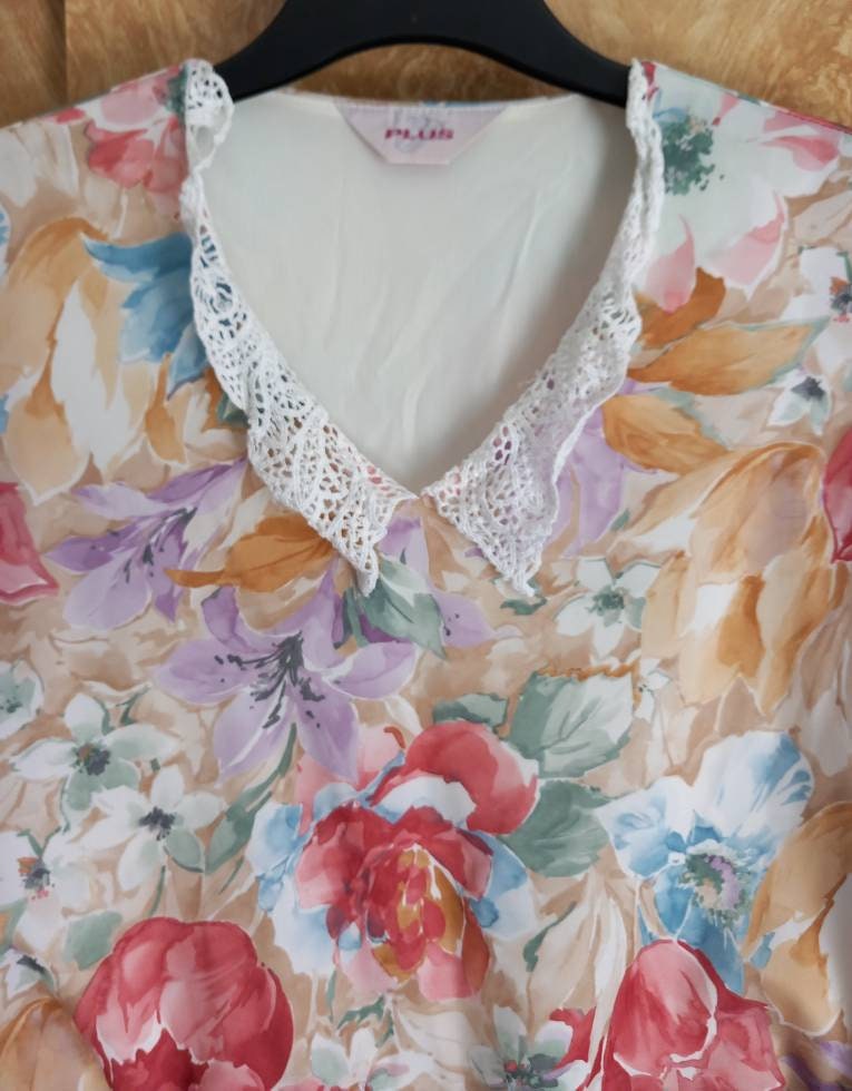 Pretty vintage chintz dress with pleated skirt and crocheted lace collar. It also has a tie belt which isnt in the picture. Size 18 but more of a modern 16/18 (bust 42 ins, waist 36 ins unstretched), good condition showing minor wear.