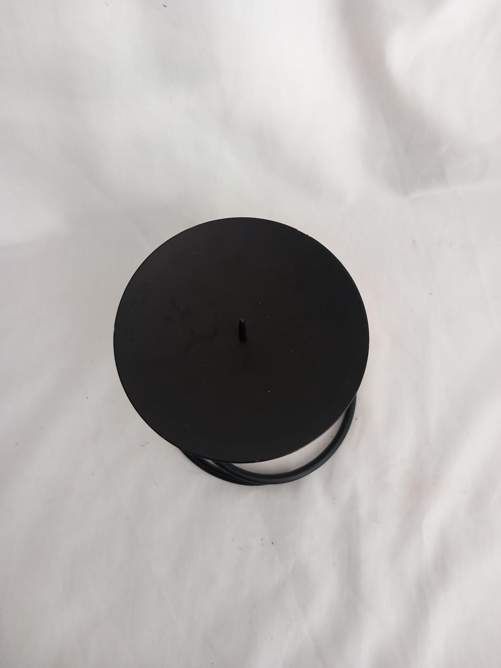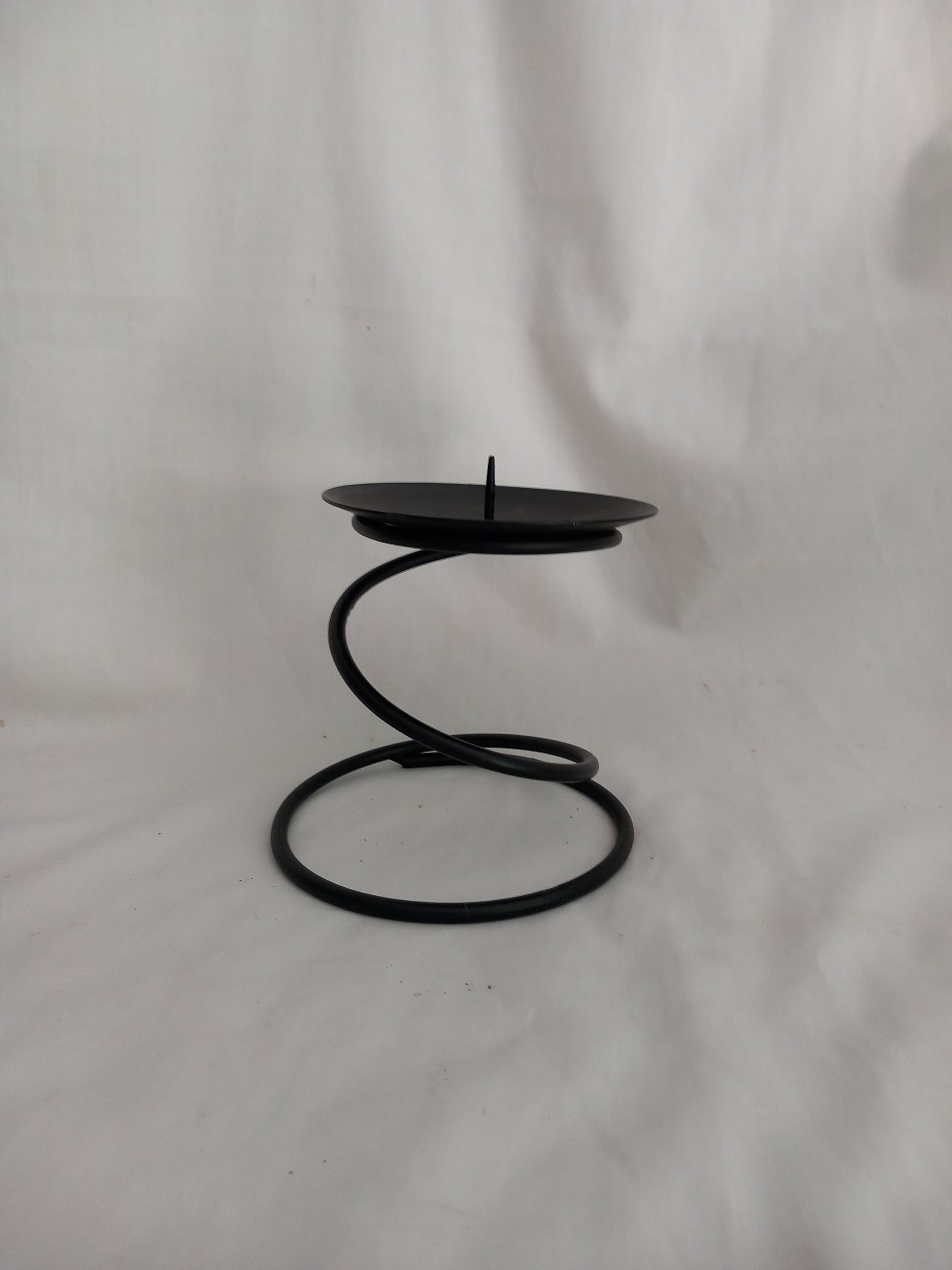 Vintage 1990s hand made black curled spiral design wrought iron candlestick, 4.5 inches tall. Good vintage condition.