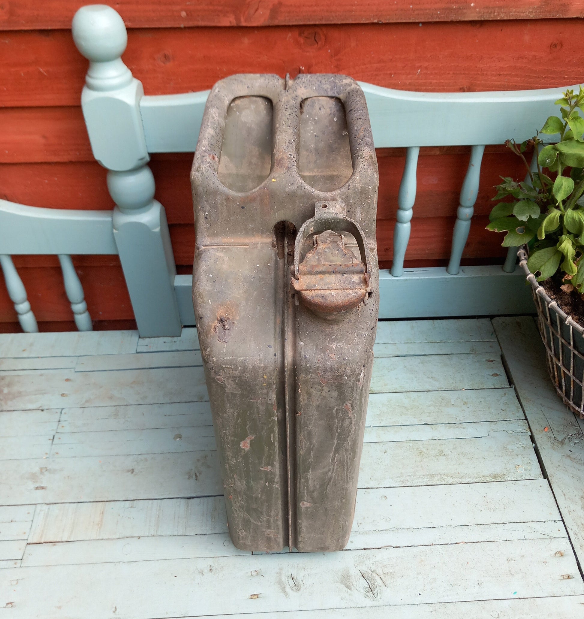 Vintage military metal jerry can in khaki green, 18.5 x 13.5 x 6.25 inches. It is marked 1969 and RG. Barn find in rustic condition but it is still watertight.