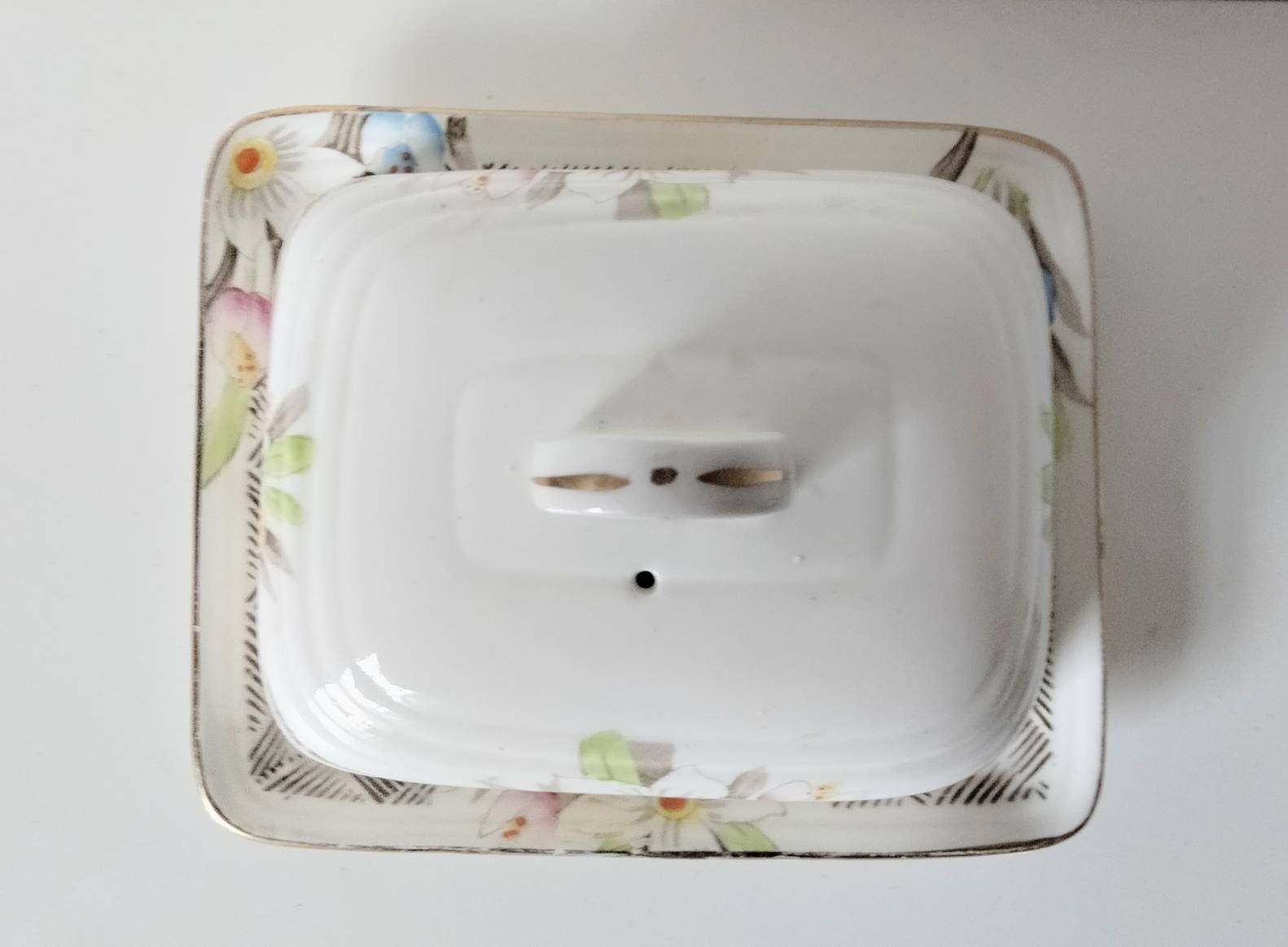 Art deco hand painted spring bulb flower design cheese or butter lidded dish