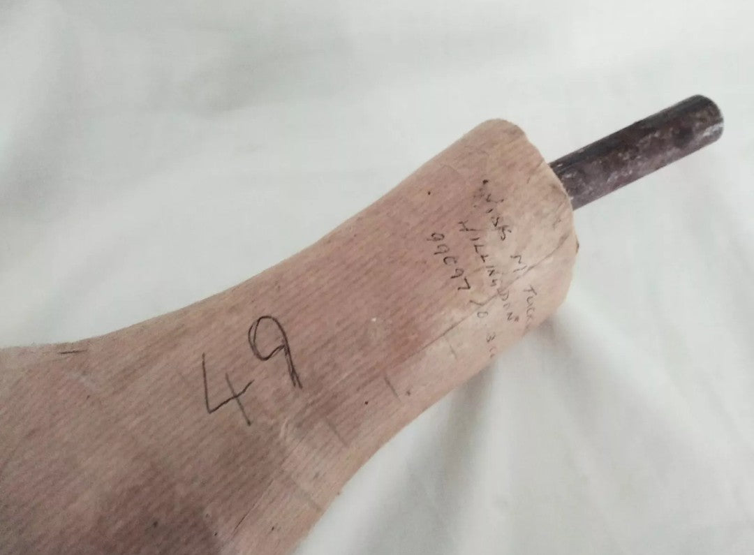 This is a vintage bespoke shoemaker's last which came from one of the only remaining shoe making companies in Northampton. It is a plaster mould of an unusually shaped foot which was taken in order to make bespoke shoes to fit the customer. It is made of plaster covered with brown paper and leather and has the clients details written on it. It measures approx 14.5 inches including the metal pole.